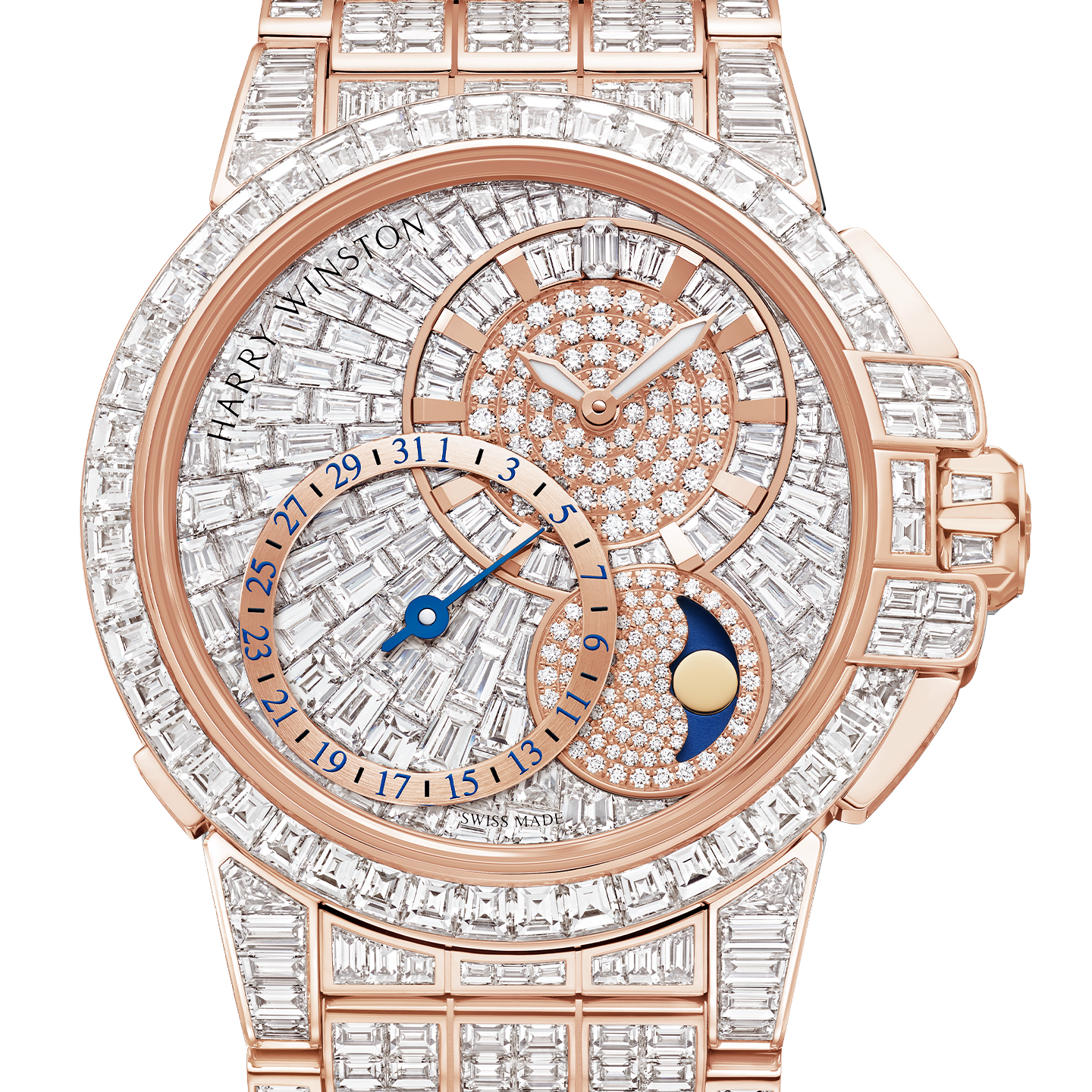The House of Harry Winston unveils a stunning high jewelry version of its Ocean Date Moon Phase adorned with 38 carats of the most exquisite diamonds. A divine marriage of high jewelry and high-end watchmaking, the limited-edition Ocean navigates the seas of time with resplendent beauty and superlative precision.