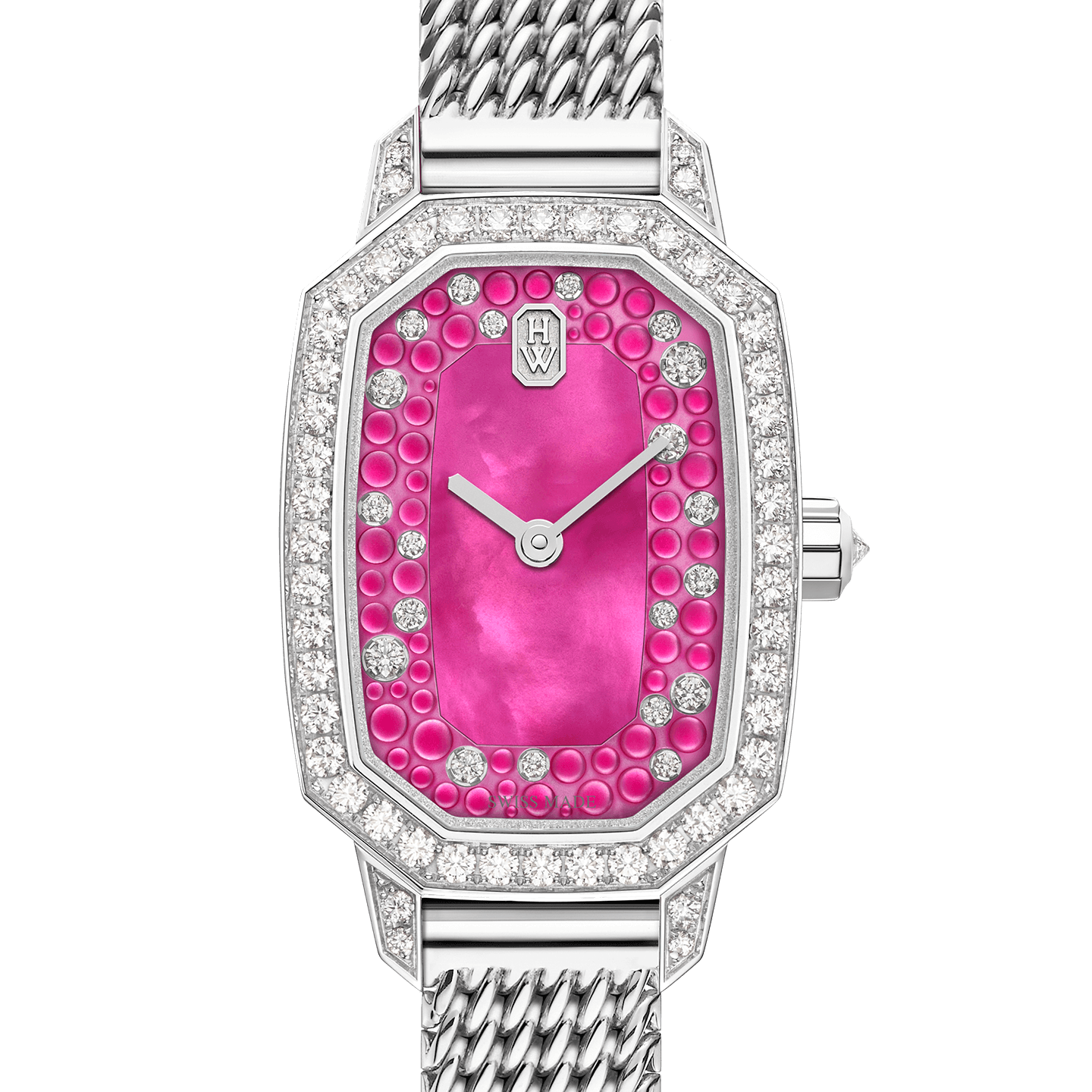 A new palette of captivating colors enriches Harry Winston’s sophisticated Emerald collection. With a winning combination of iridescent mother-of-pearl and icy diamonds, the dial of this Emerald timepiece delights with colorful cabochon adornments.