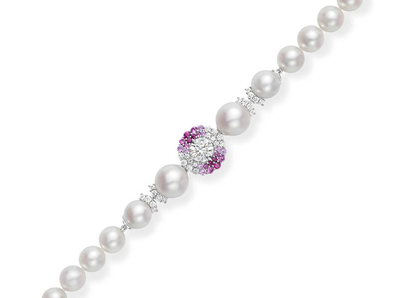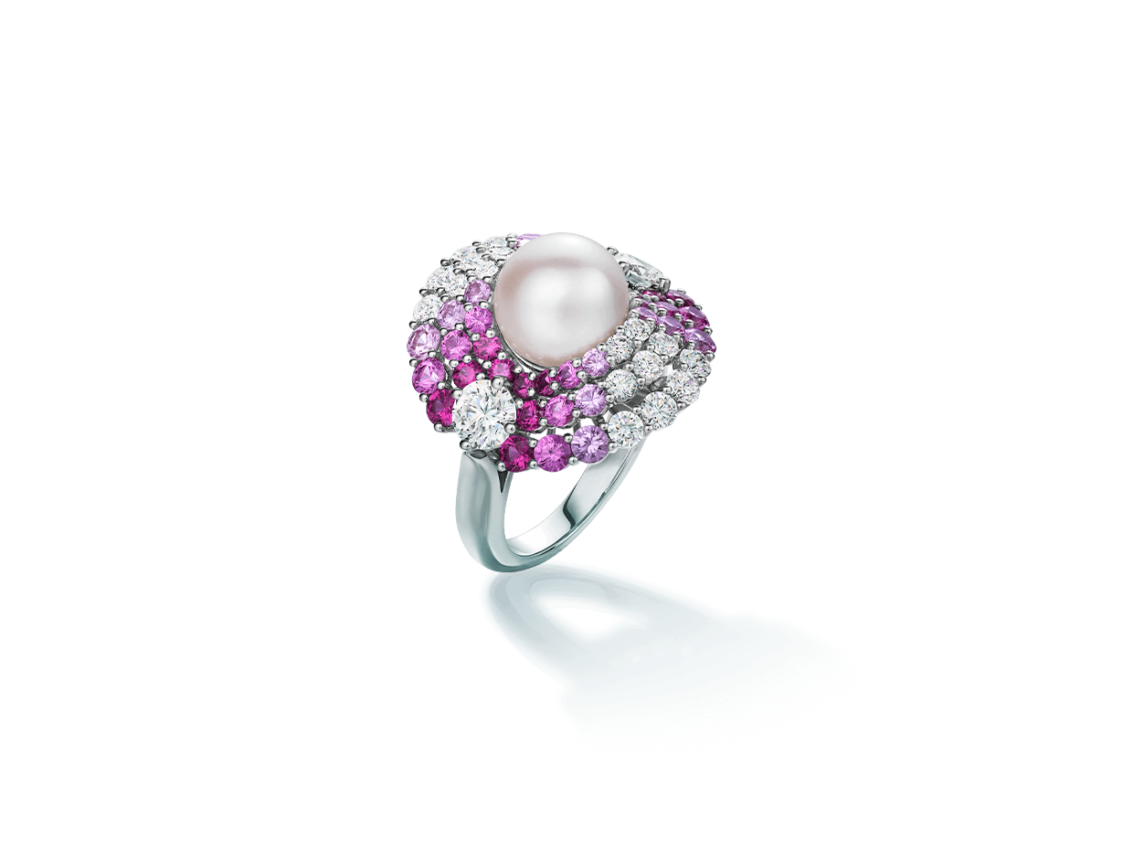 Surrounded by a vibrant arrangement of rubies, pink sapphires, and diamonds, the jewel’s white Akoya pearl center stone mirrors the evocative beauty of Bermuda’s shores.