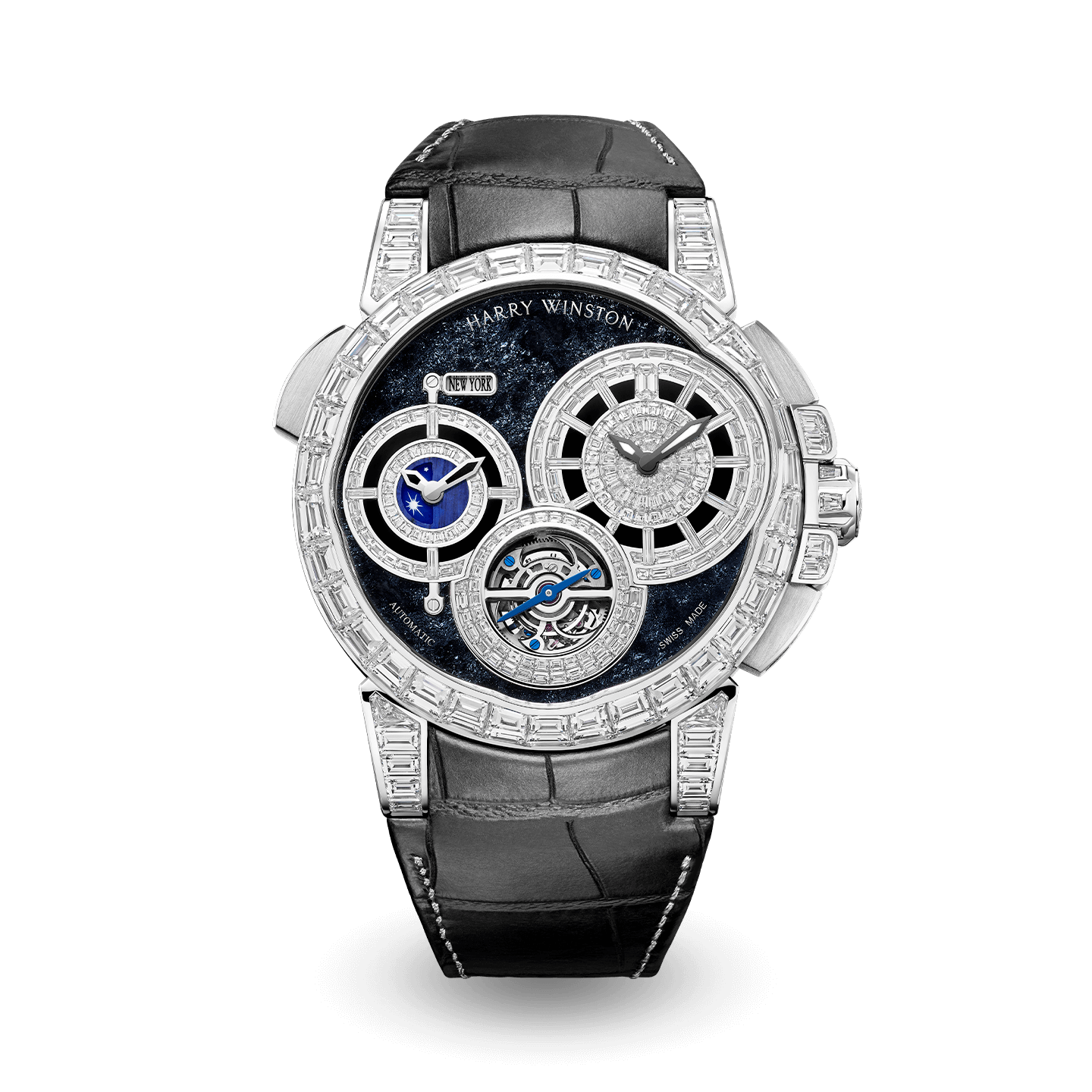 Harry Winston presents a timepiece that navigates the high seas of horological complications and the exquisite world of high jewelry. Limited to just five pieces, the Ocean Tourbillon GMT Worldtimer is equipped with a GMT function displaying two time zones simultaneously. Harry Winston’s gem-setters have created a masterpiece with 388 gleaming diamonds invisibly set and powered by a mesmerizing tourbillon.