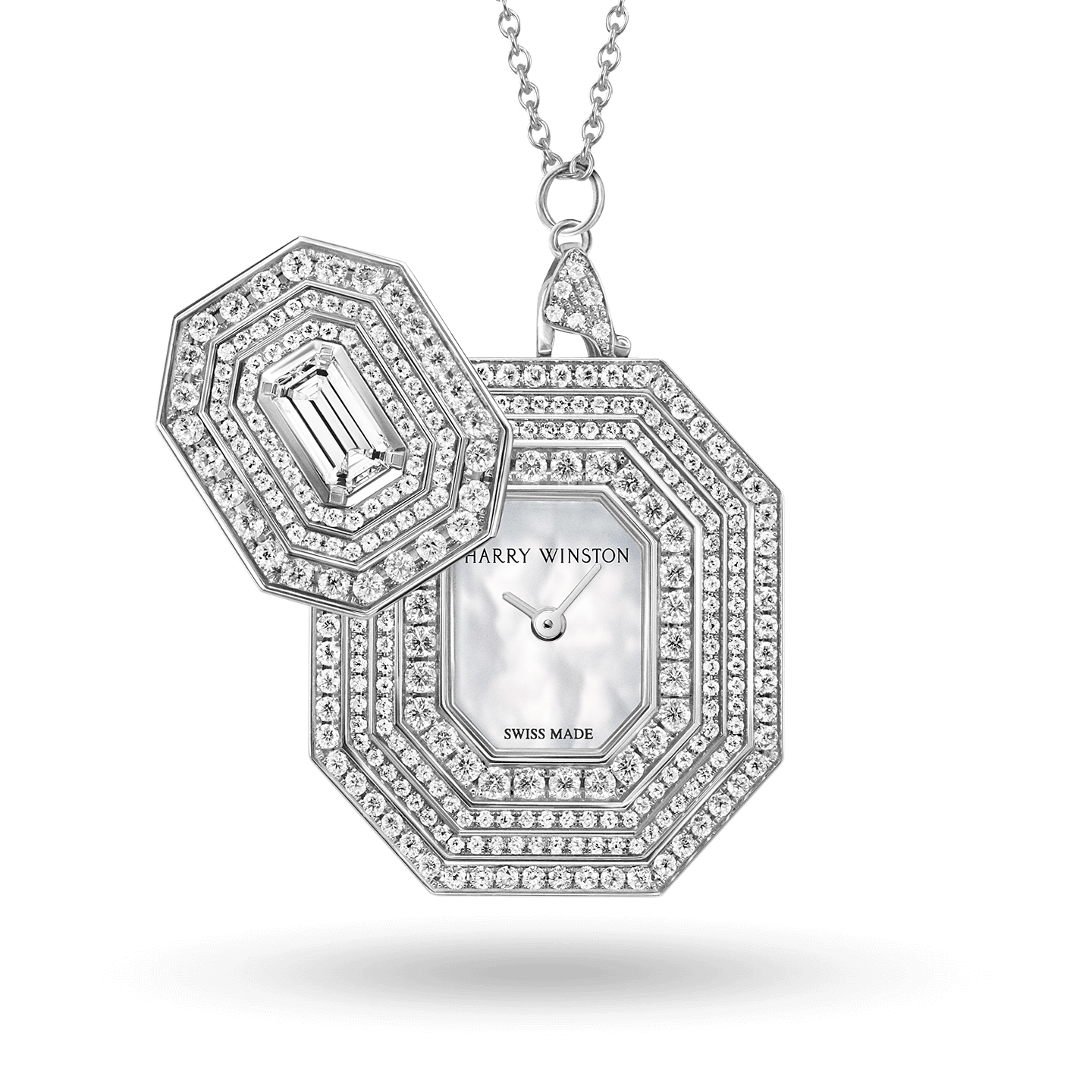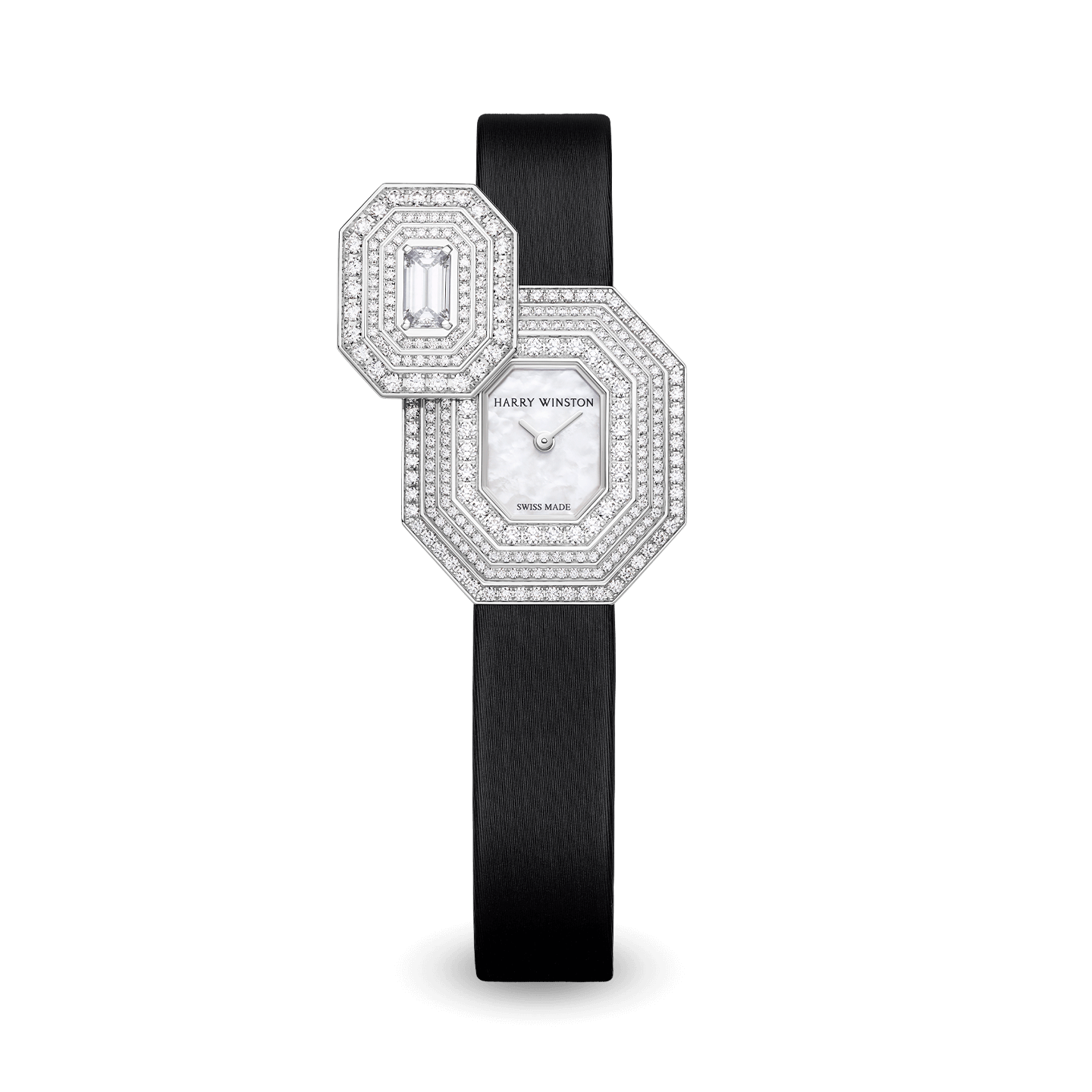 The Emerald Signature celebrates the sophistication and grace of an emerald-cut diamond, Mr. Winston’s preferred shape. Set with a myriad of diamonds, this refined timepiece can be worn on the wrist, as an exquisite brooch, or as a precious pendant glistening around the neck.