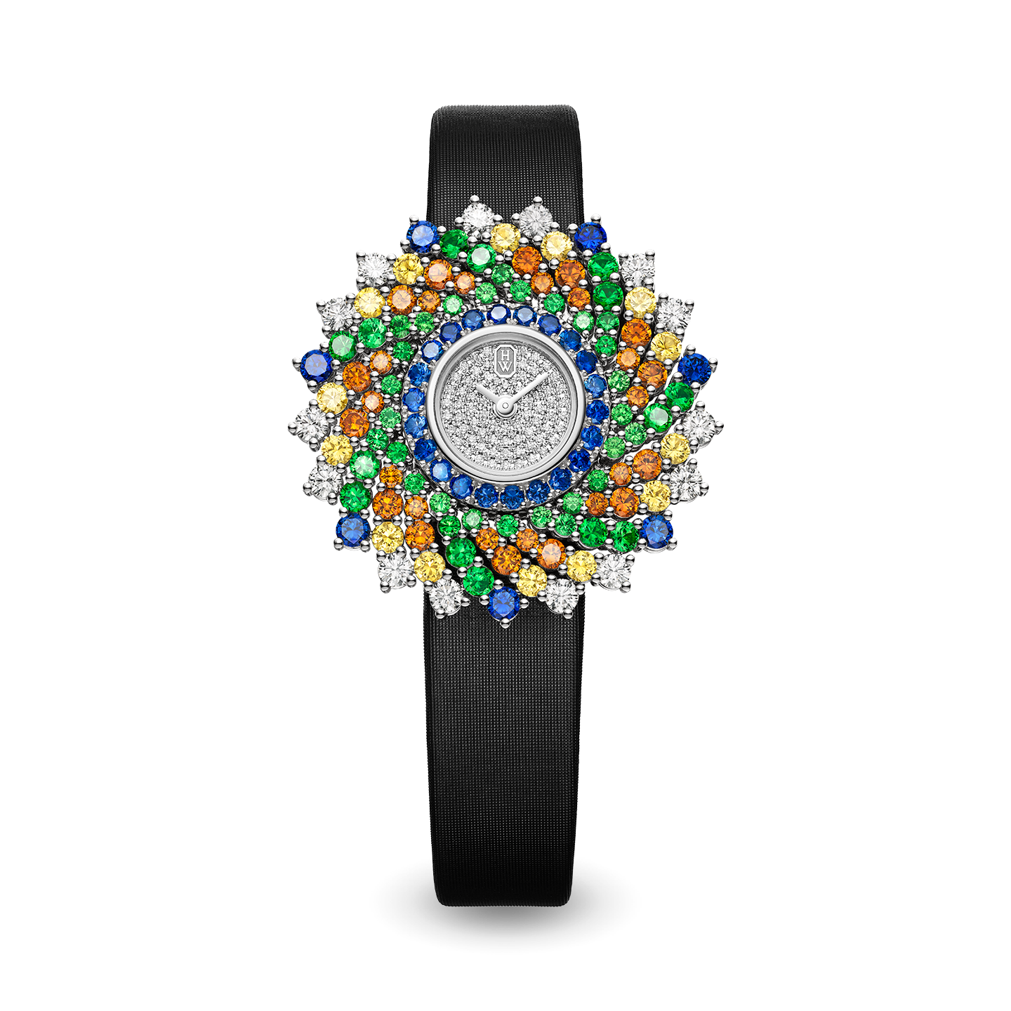 Precious gemstones clustered around the case create a sparkling explosion of color and depth. A dazzling evening accessory, the Winston Kaleidoscope timepiece showcases the design creativity and gem-setting expertise that characterize the House of Harry Winston.
