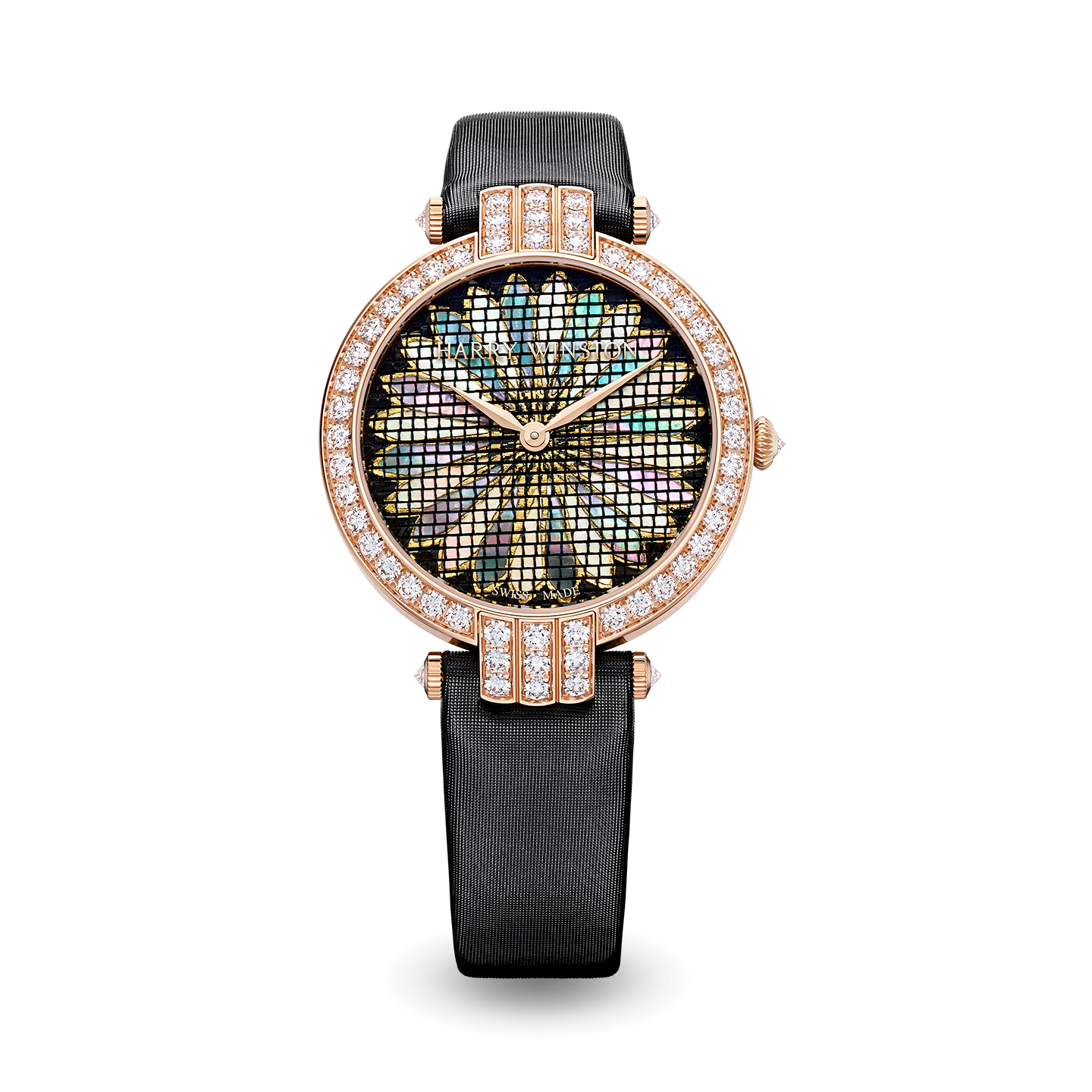 The Premier Precious Weaving Automatic 36mm unveils a sublime hand-woven know-how honoring Mr. Winston’s boundless creative spirit. This artistic crafts creation, is the fruit of a rare Japanese weaving technique in which threads of gold are woven with slivers of natural mother-of-pearl to create a unique tapestry of shimmering beauty.