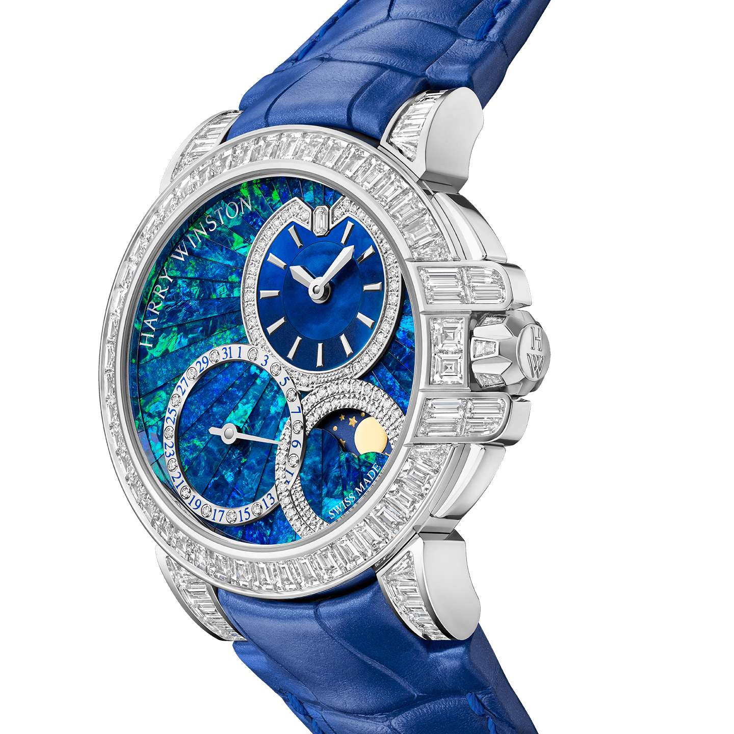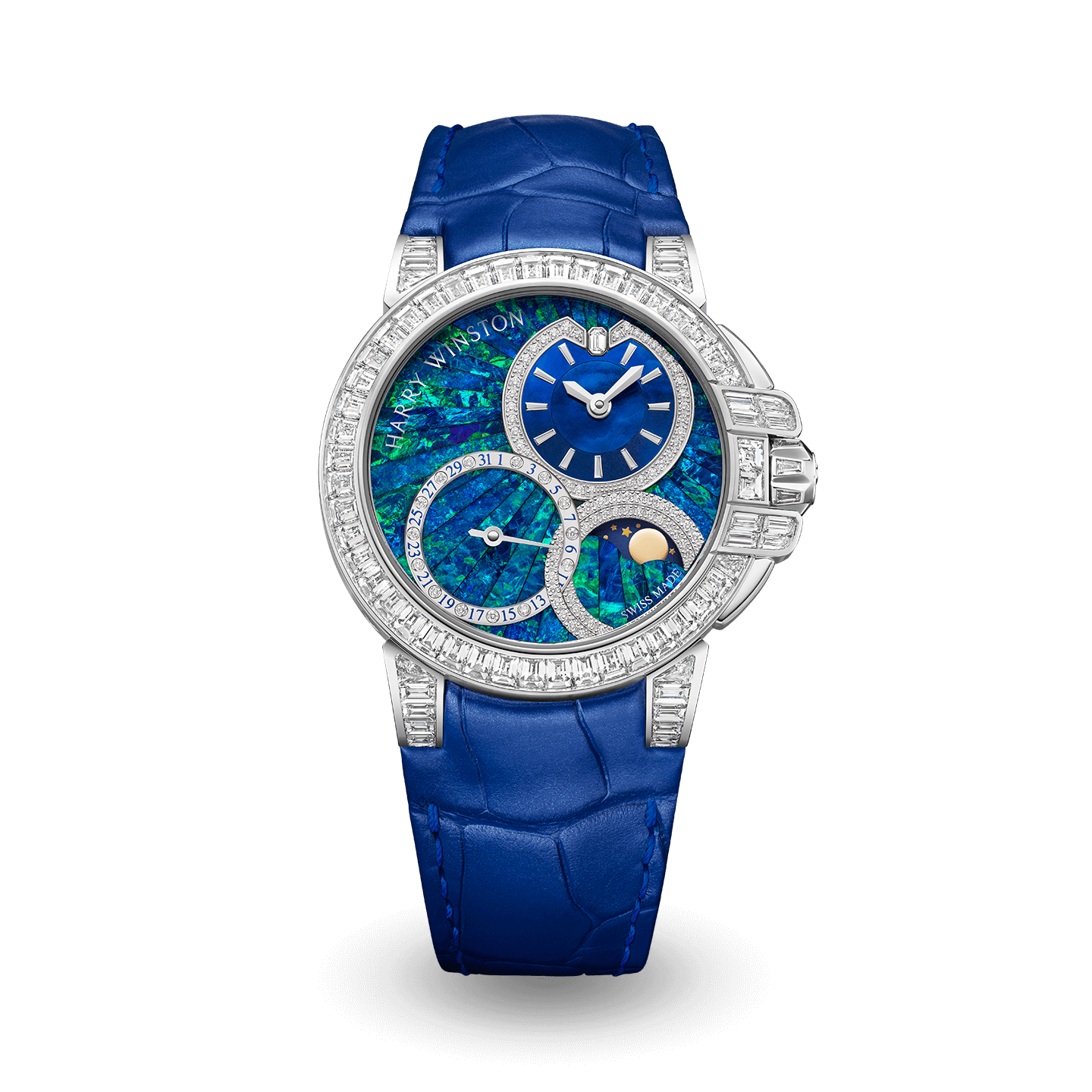 Harry Winston unveils a timepiece from its Ocean Collection with a mesmerizing opal dial and an intense sparkle of diamonds. Limited to just five pieces, the Ocean Date Moon Phase Automatic 36mm features Australian Blue Opal Crystal, the rarest and most valuable type of precious opals. Employing the delicate and refined art of stone marquetry, the craftsmanship behind this dial is a testament to the skill of Harry Winston’s artisans. This timepiece is an open invitation to navigate the seas.