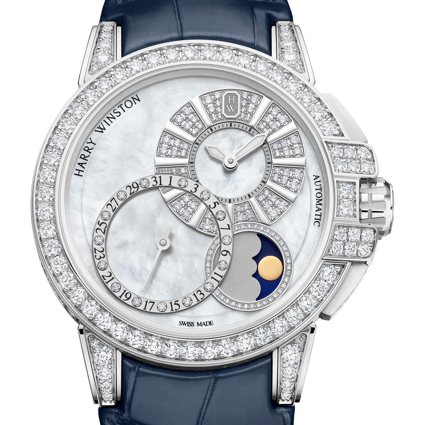 The House of Harry Winston unveils an Ocean timepiece with an entirely new dial configuration. Continuing to uphold the principles of the Ocean collection, the latest model alters its course and offers a captivating asymmetrical layout for the phases of the moon, the time and the date. Embellished with shimmering mother-of-pearl and a sea spray of diamonds, the Ocean Date Moon Phase is destined to become a classic.