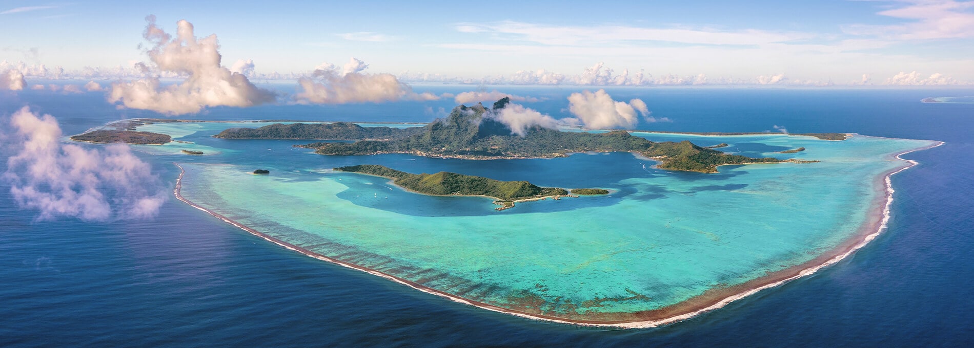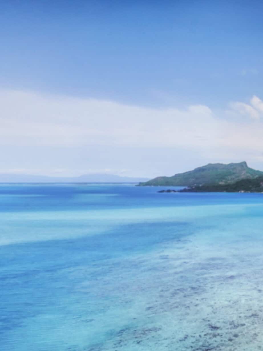 A landscape video pans across overwater huts in Bora Bora, showing wooden bungalows built above calm, crystal-clear water with distant mountains in the background.
