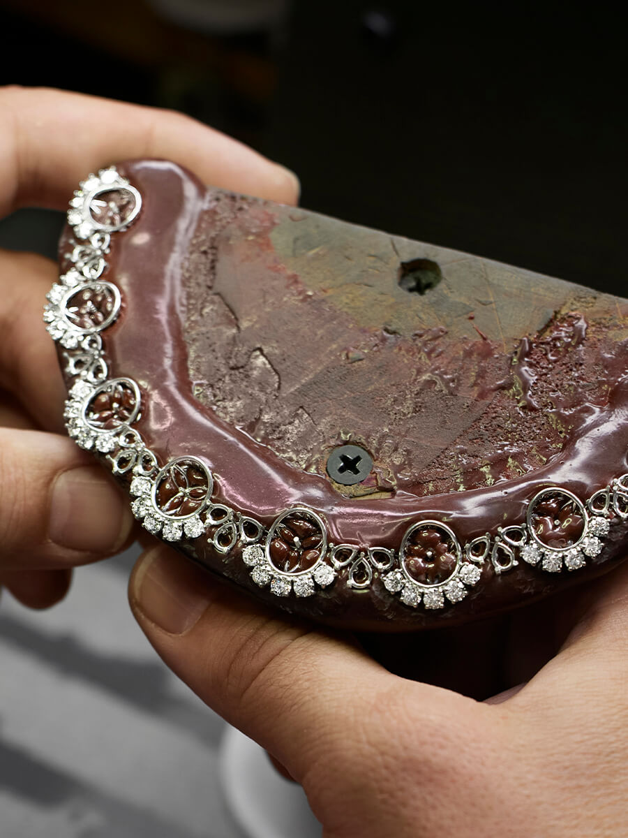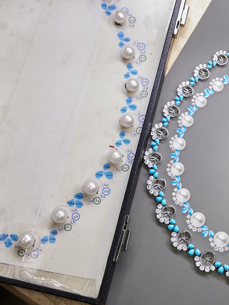 The Bora Bora necklace is displayed on a designer desk image. The video then pans to a close-up shot of the Necklace with the image in the background.