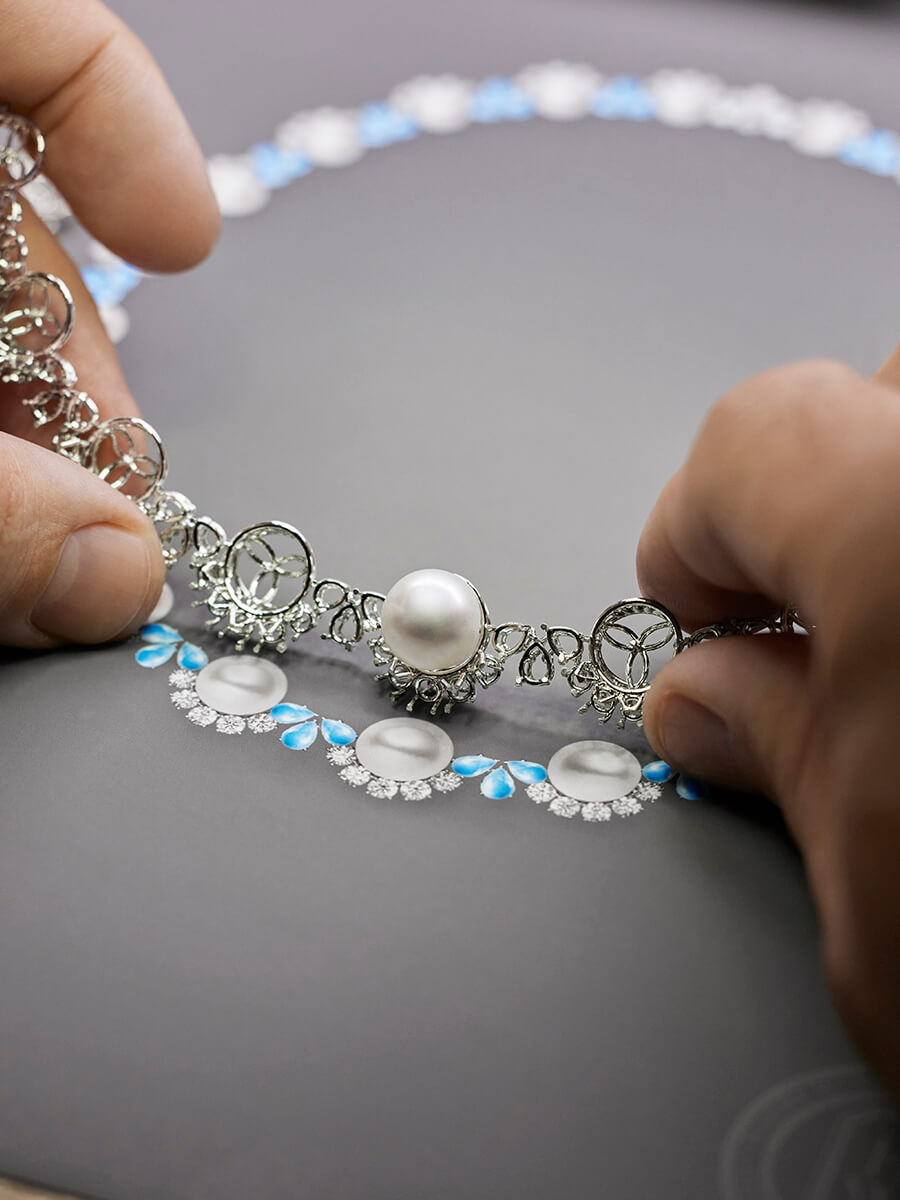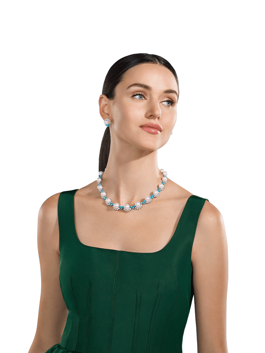 The Bora Bora Suite is beautifully modeled on a woman wearing a vibrant green dress. Focus then shifts to the Bora Bora Earrings, featuring White South Sea, each illuminated by a halo of brilliant diamonds and pear-shaped turquoise cabochons. The piece concludes with a final close-up shot of the Bora Bora Necklace.