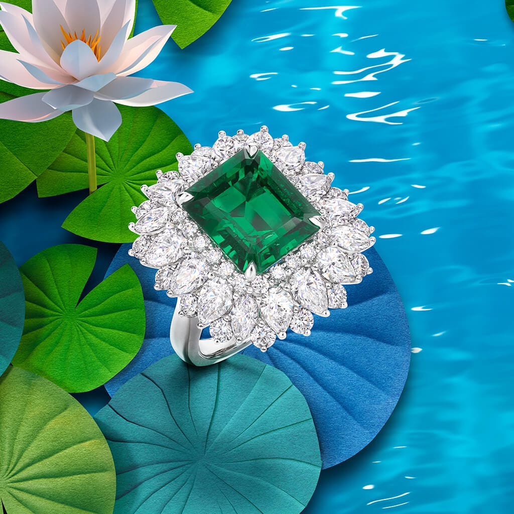An exceptional 6.64 carat emerald takes center stage in this breathtaking creation, its vivid hue nodding to nature’s lush beauty. Encircled by tiers of fancy-shaped diamonds, the one-of-a-kind ring exquisitely resembles a flower in bloom.