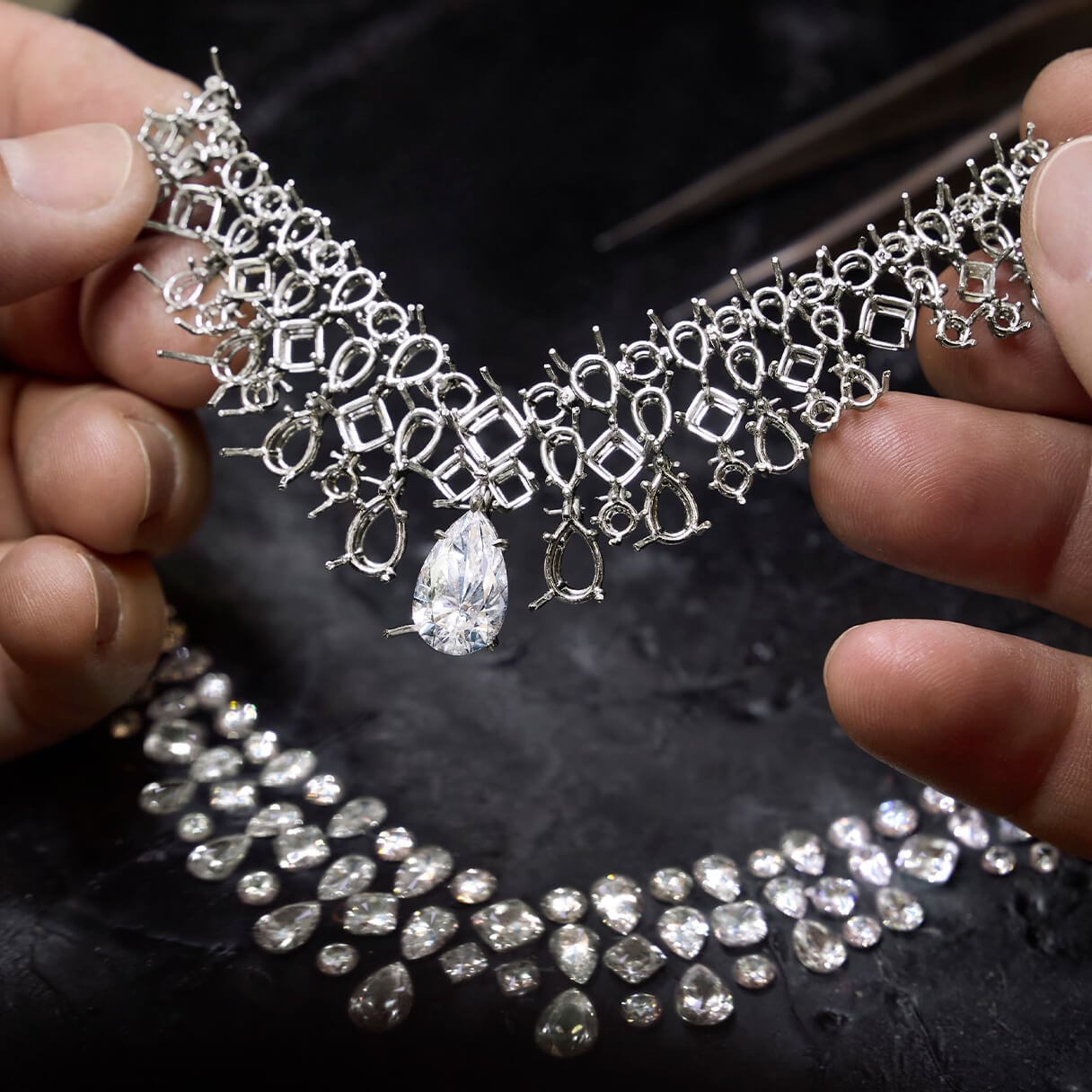 266 round brilliant, cushion-cut, and pear-shaped diamonds flow in a mesmerizing cascade, each stone carefully selected and positioned to capture light from every angle. The fluid V-shaped design descends gracefully for an effect as captivating as the red carpet moments it is destined to illuminate.
