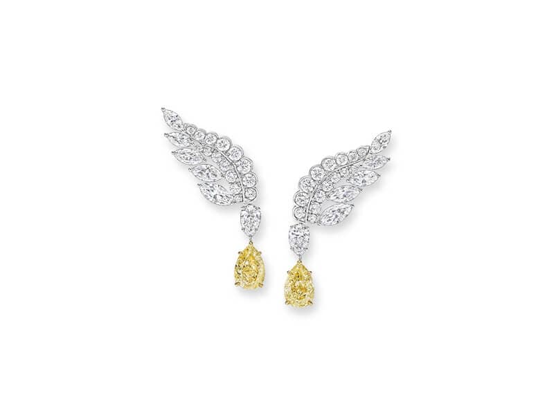 This majestic jewel pays homage to the cast-iron eagles adorning many of New York’s iconic buildings. With pear-shaped, marquise, and round brilliant diamonds highlighting a radiant pear-shaped fancy yellow diamond center stone, the Eagle necklace beautifully mimics its namesake bird in flight.