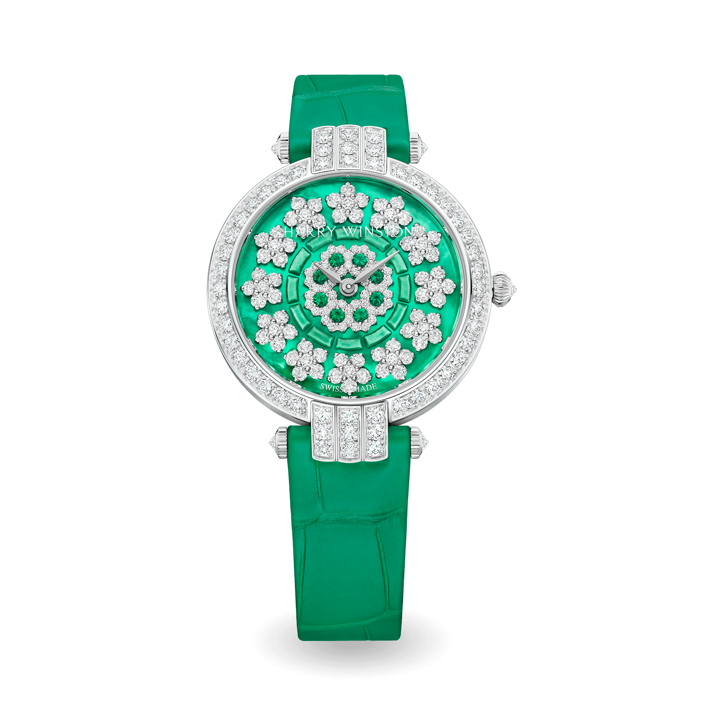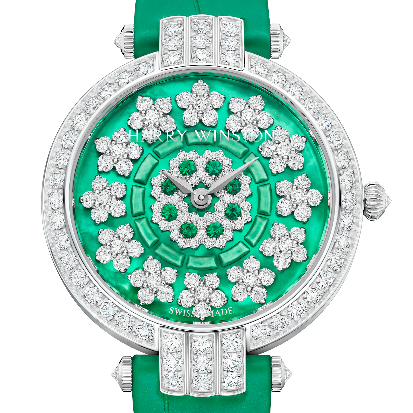 The Premier timepiece collection welcomes a white gold model embellished with the iconic Sunflower motif featured in the eponymous Harry Winston fine jewelry collection. Once again, the House of Harry Winston transforms the natural beauty of a sunflower into a precious jewel whose beauty will never fade.