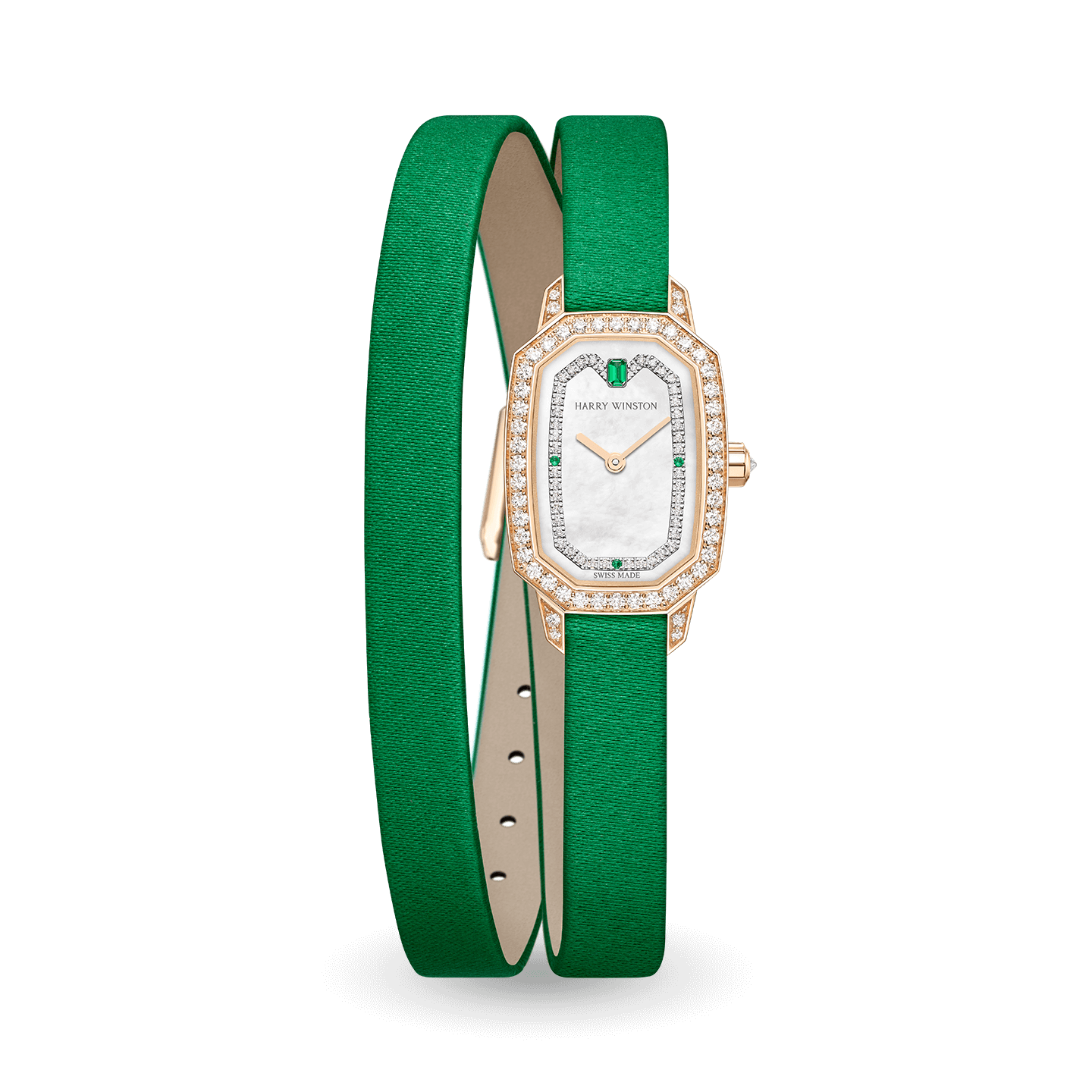 Adorned with intense green tones, diamonds and mother-of-pearl, the Harry Winston Emerald is the perfect luxury accessory for women who want both the practicality of a timepiece and the hallmark glamour of Harry Winston jewels.