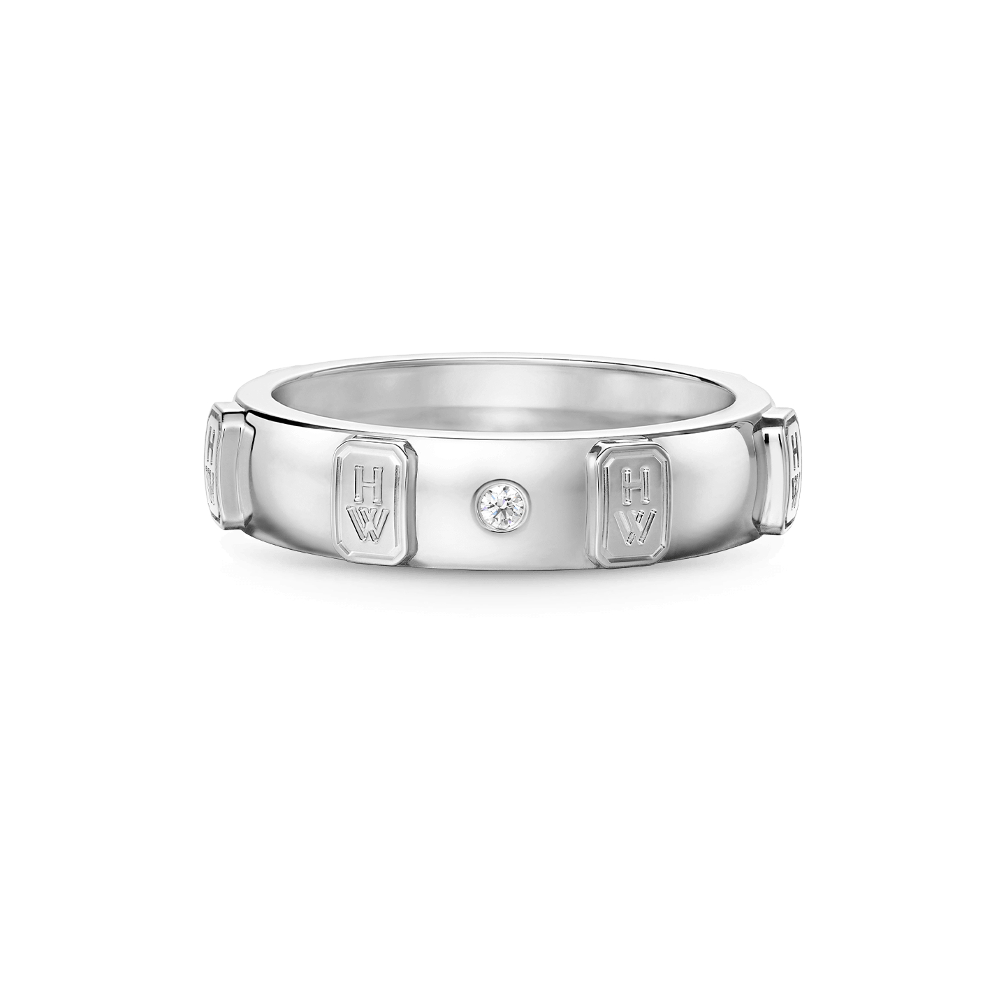 Adorned with the House of Harry Winston’s iconic “HW” hallmark and a round brilliant diamond, the HW Logo Band is the perfect complement for one of life’s most meaningful moments.