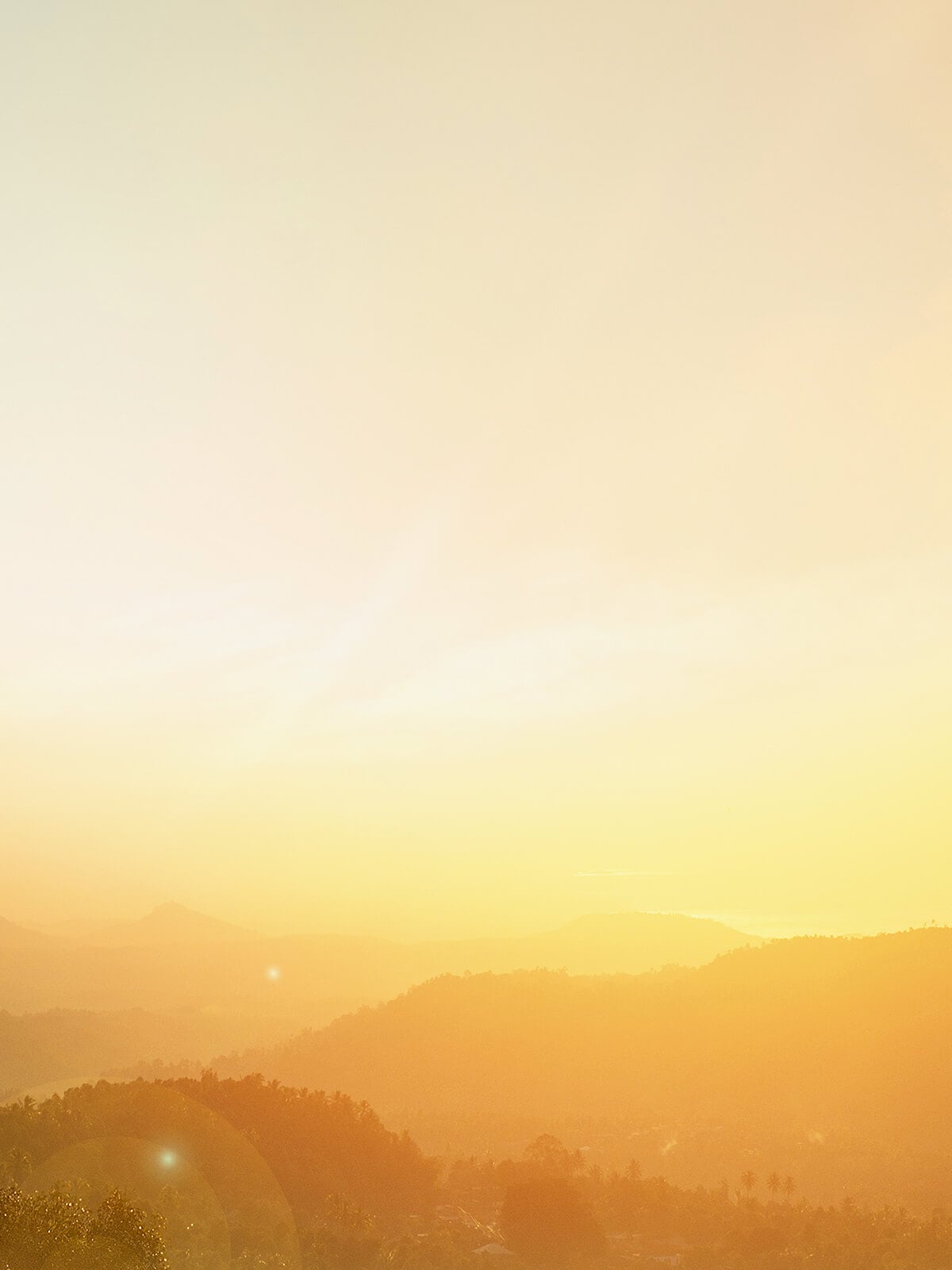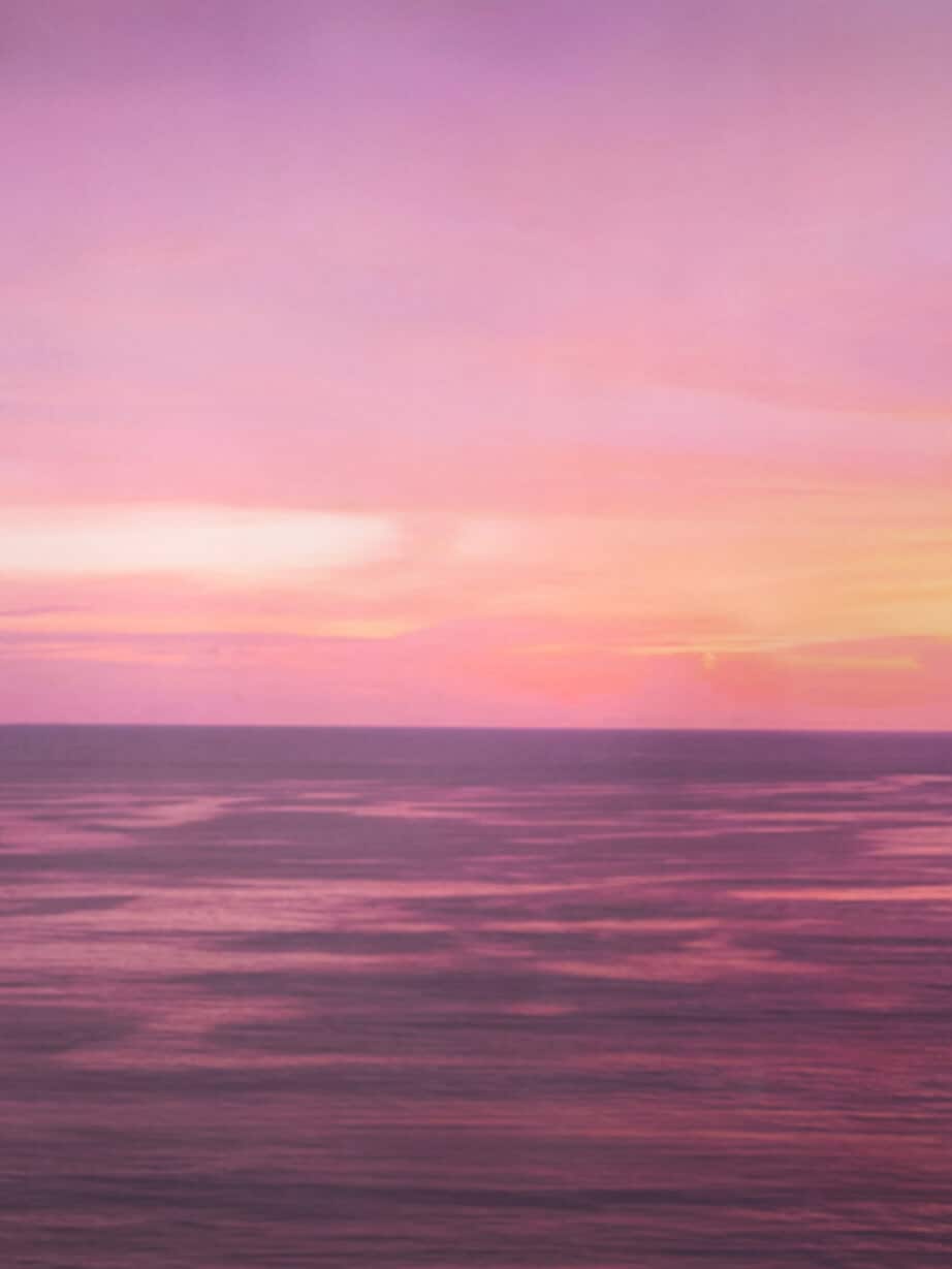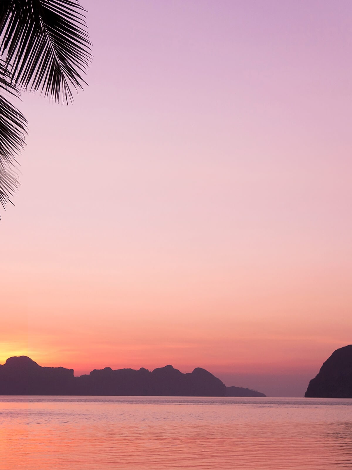 In the distance, the sky glows in hues of deep orange and pink, as the setting sun casts its final light behind the towering outlines of swaying palm trees and rolling waves.
