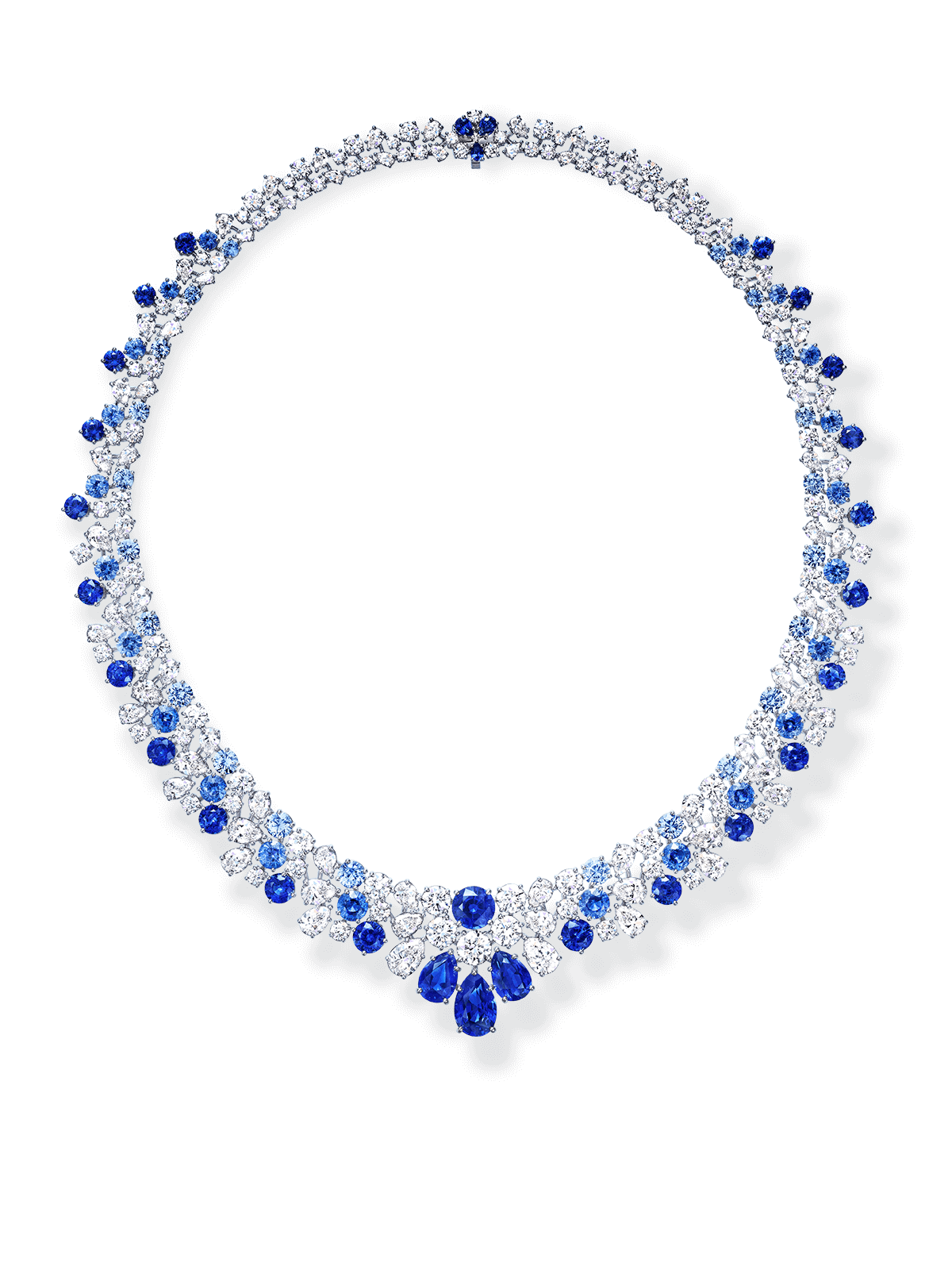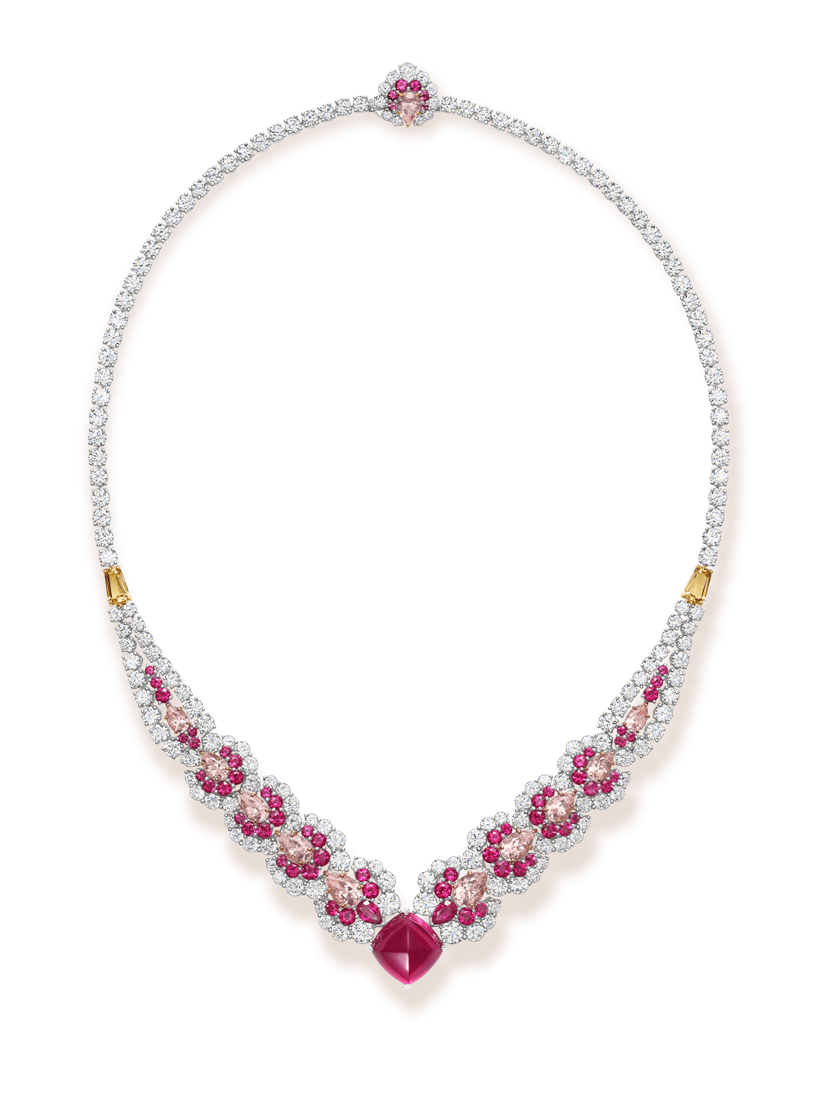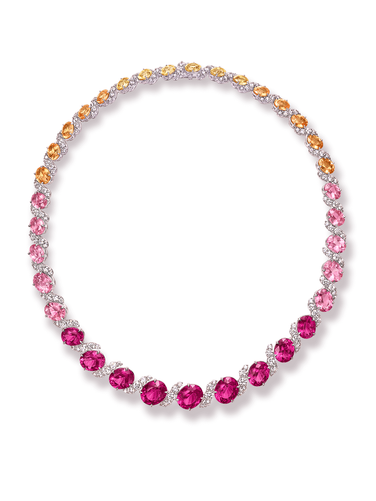 The scene opens with a close-up of the Oahu Sunset Necklace, its fiery pink gemstones and radiant diamonds glowing against a white backdrop. The focus then shifts to the St. Moritz Necklace, its glistening diamonds and blue sapphires capturing the brilliance of snow touched by the winter sun. Next, the camera highlights the Tahiti Necklace, where black pearls shimmer with a lustrous depth, its beautiful color palette an homage to the world’s most captivating beaches. In the final sequence, all three high jewelry necklaces are revealed once more, captured from new angles to unveil their full splendor.
