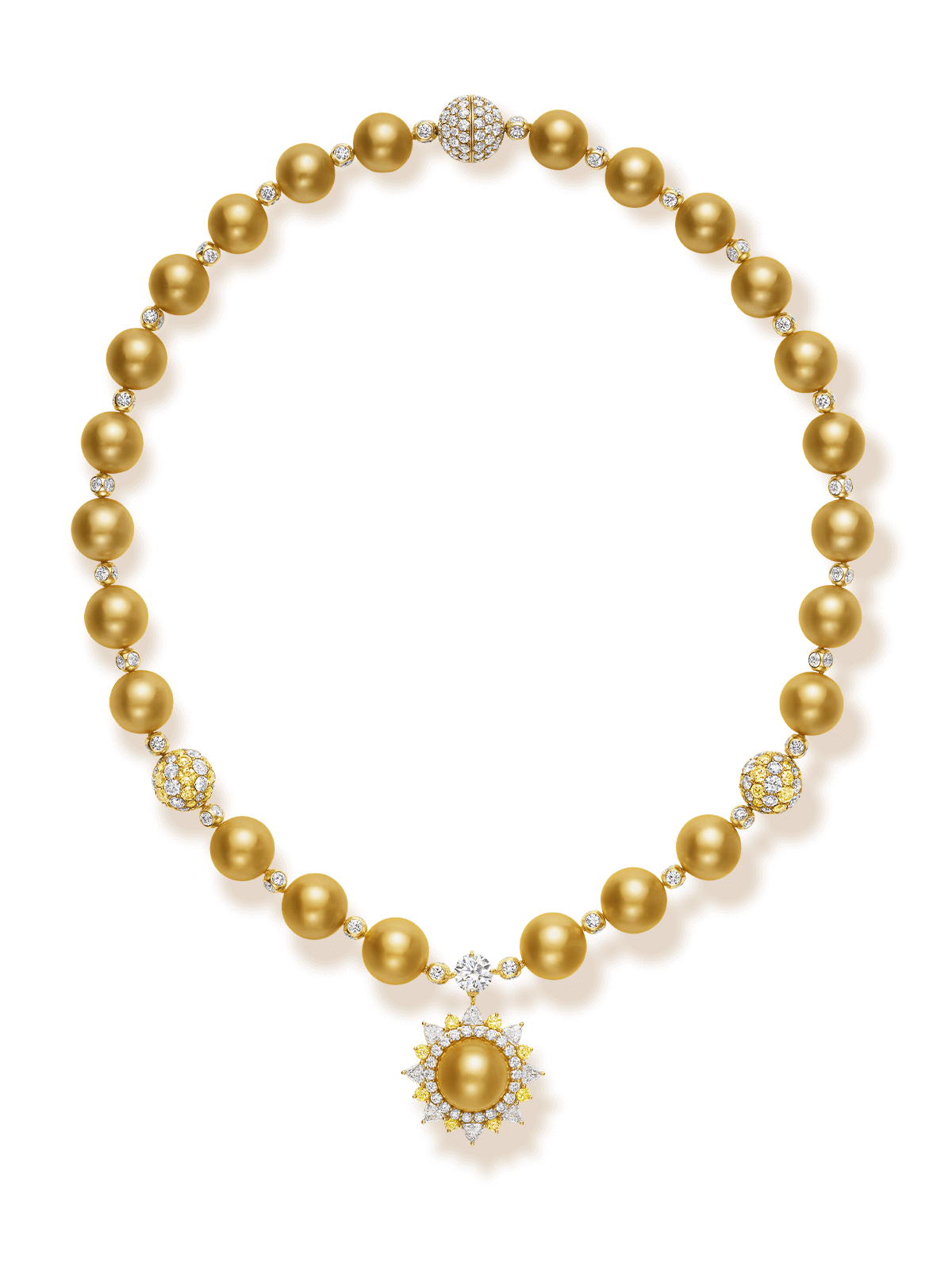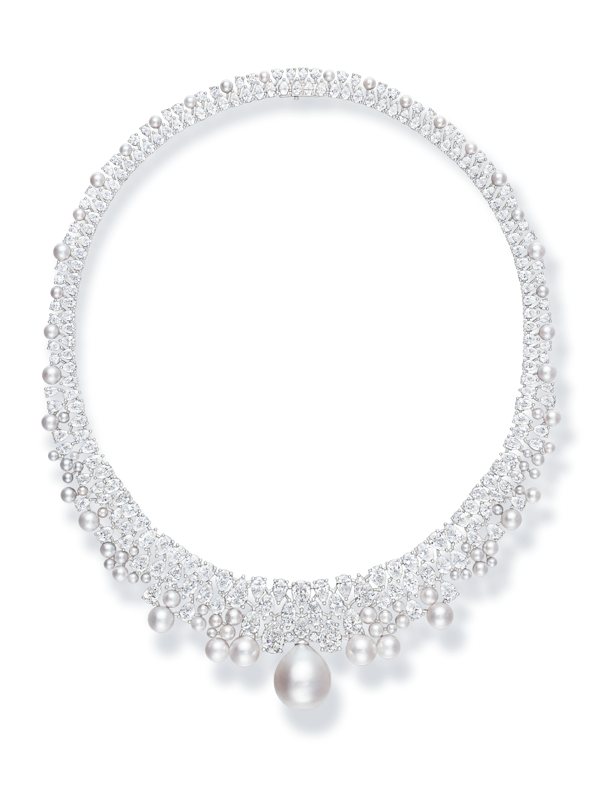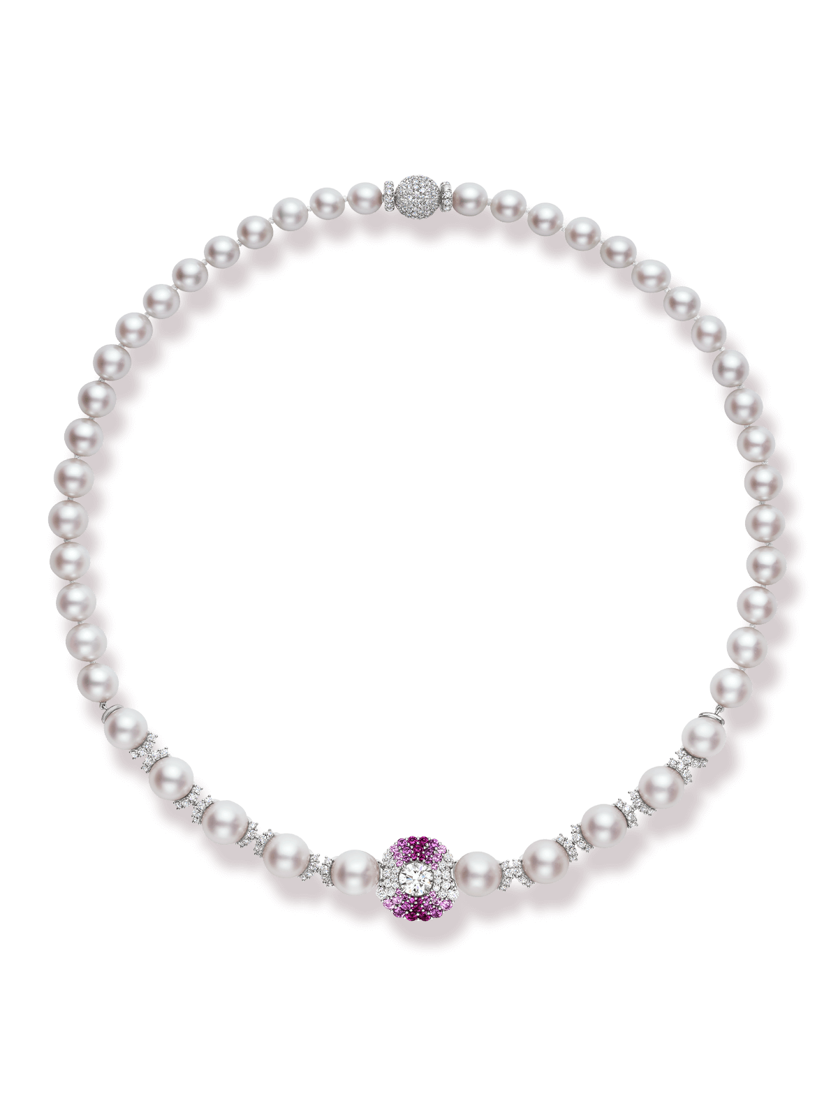 The scene opens with a close-up of the Oahu Sunset Necklace, its fiery pink gemstones and radiant diamonds glowing against a white backdrop. The focus then shifts to the St. Moritz Necklace, its glistening diamonds and blue sapphires capturing the brilliance of snow touched by the winter sun. Next, the camera highlights the Tahiti Necklace, where black pearls shimmer with a lustrous depth, its beautiful color palette an homage to the world’s most captivating beaches. In the final sequence, all three high jewelry necklaces are revealed once more, captured from new angles to unveil their full splendor.