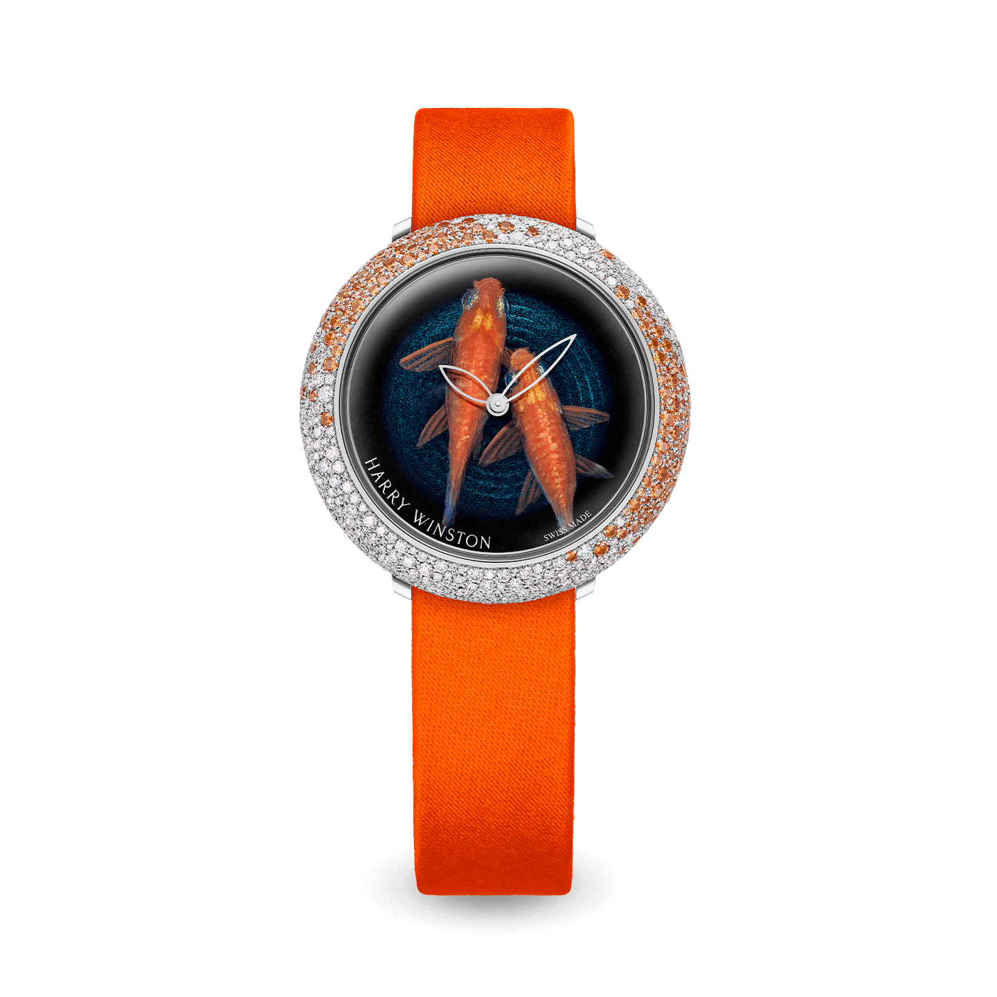 A collection of ten unique timepieces with dials made by internationally acclaimed Japanese artist Riusuke Fukahori. Renowned for his "2.5 Dimensional Painting" technique for goldfish, Fukahori has succeeded in miniaturizing his artwork to fit the confines of a timepiece. This incredible piece of art called "Eternal love" is an 18K white gold timepiece case set with 1482 brilliant-cut diamonds and 279 brilliant-cut orange spessartites. Each unique model comes with a sleek satin strap matching the color of the artwork and a fabulous snow-set diamond necklace chain.