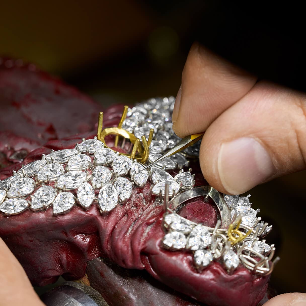 The opening shot shows a close-up of the hands of a Harry Winston master jeweler picking up a 16.10 carat triangular Paraiba tourmaline with a pair of precision tweezers from a gray surface featuring a drawing of necklace's design. The jeweler then deftly inserts the stone into a dial gemstone gauge in order to measure it.