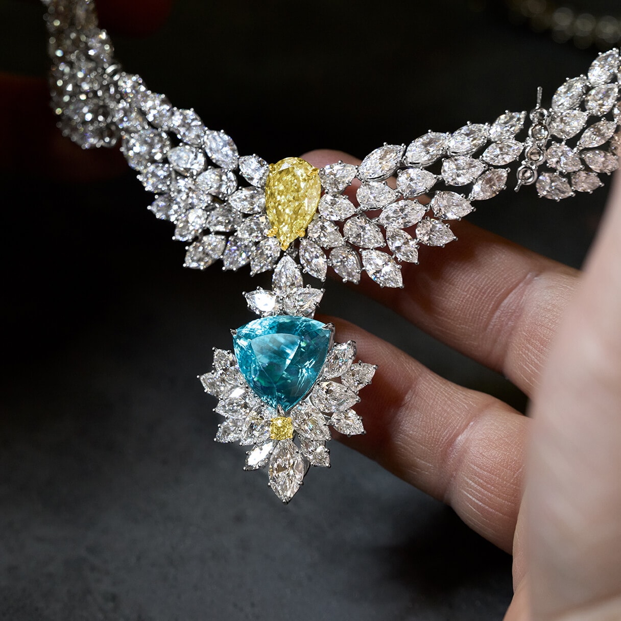 A 16.10 carat triangular Paraiba tourmaline captivates at the center of this extraordinary creation, accented by a luminous 5.01 carat pear-shaped yellow diamond and more than 65 carats of sparkling diamonds. The remarkable composition reflects Mr. Winston's diamond-driven philosophy.