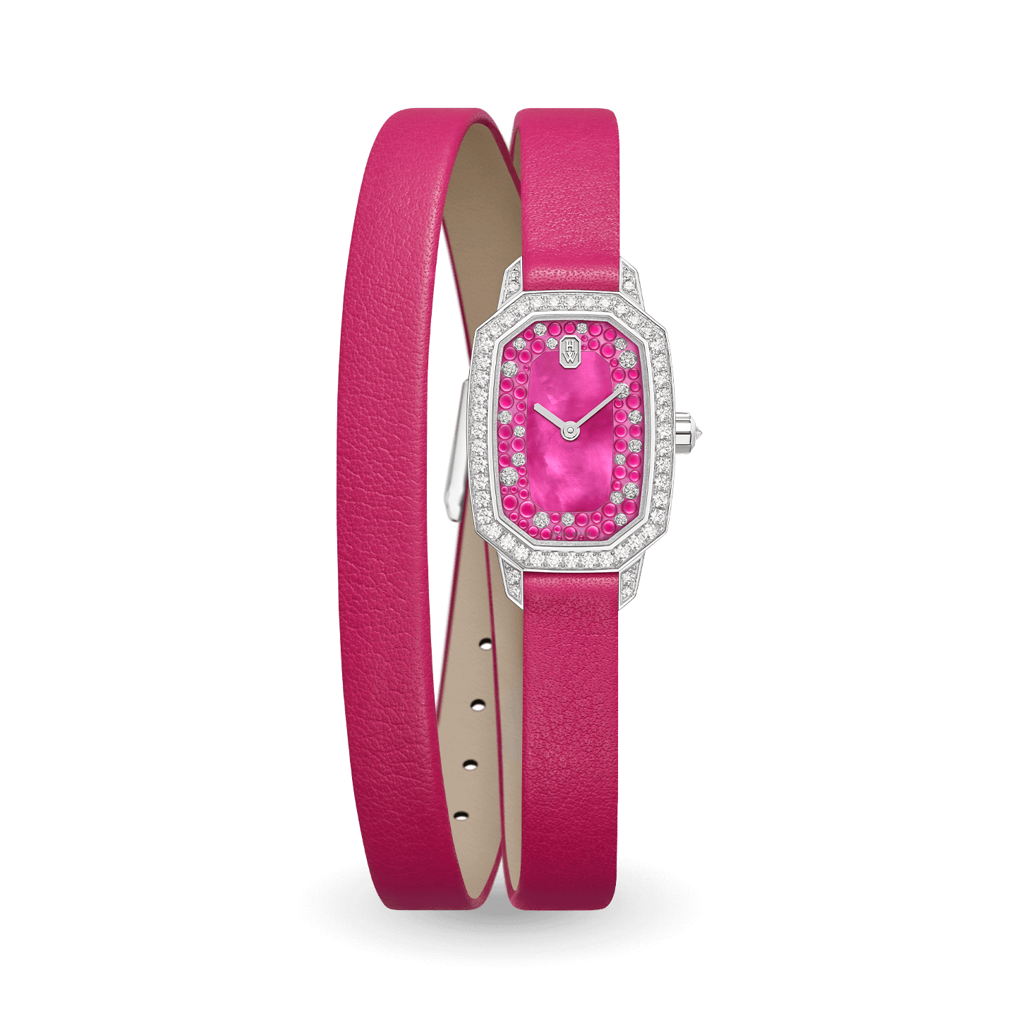 A new palette of captivating colors enriches Harry Winston’s sophisticated Emerald collection. With a winning combination of iridescent mother-of-pearl and icy diamonds, the dial of this Emerald timepiece delights with colorful cabochon adornments.