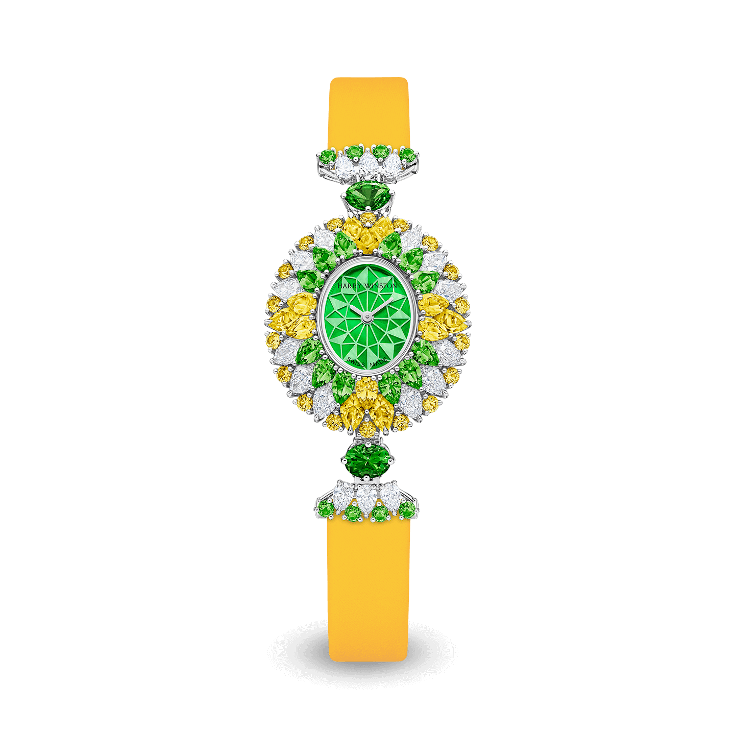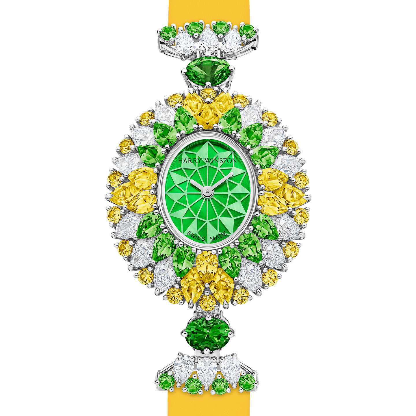 Inspired by the bright candy-colored gemstones that define the House’s Winston Candy cocktail rings, the delectable platinum Winston Candy High Jewelry Watch offers a sweet way to savor time. Incorporating the knockout glamour and intense color of the rings, this timepiece is the most delectable treat to adorn the wrist.
