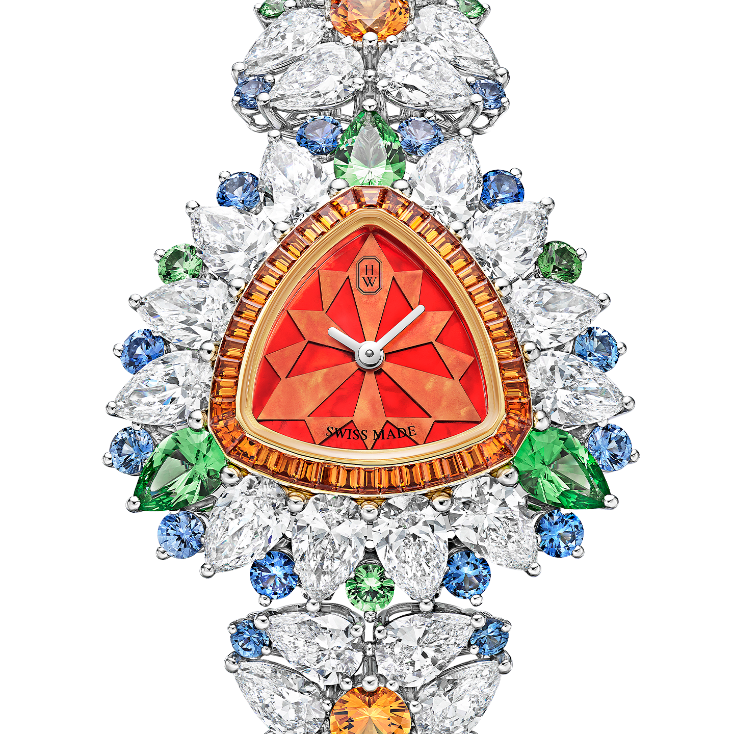 Inspired by the bright candy-colored gemstones that define the House’s Winston Candy cocktail rings, the delectable platinum Winston Candy High Jewelry Watch offers a sweet way to savor time. Incorporating the knockout glamour and intense color of the rings, this timepiece is the most delectable treat to adorn the wrist.