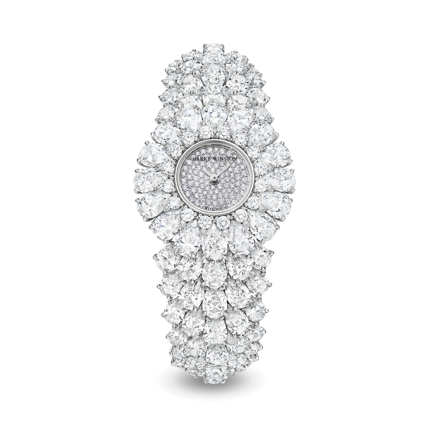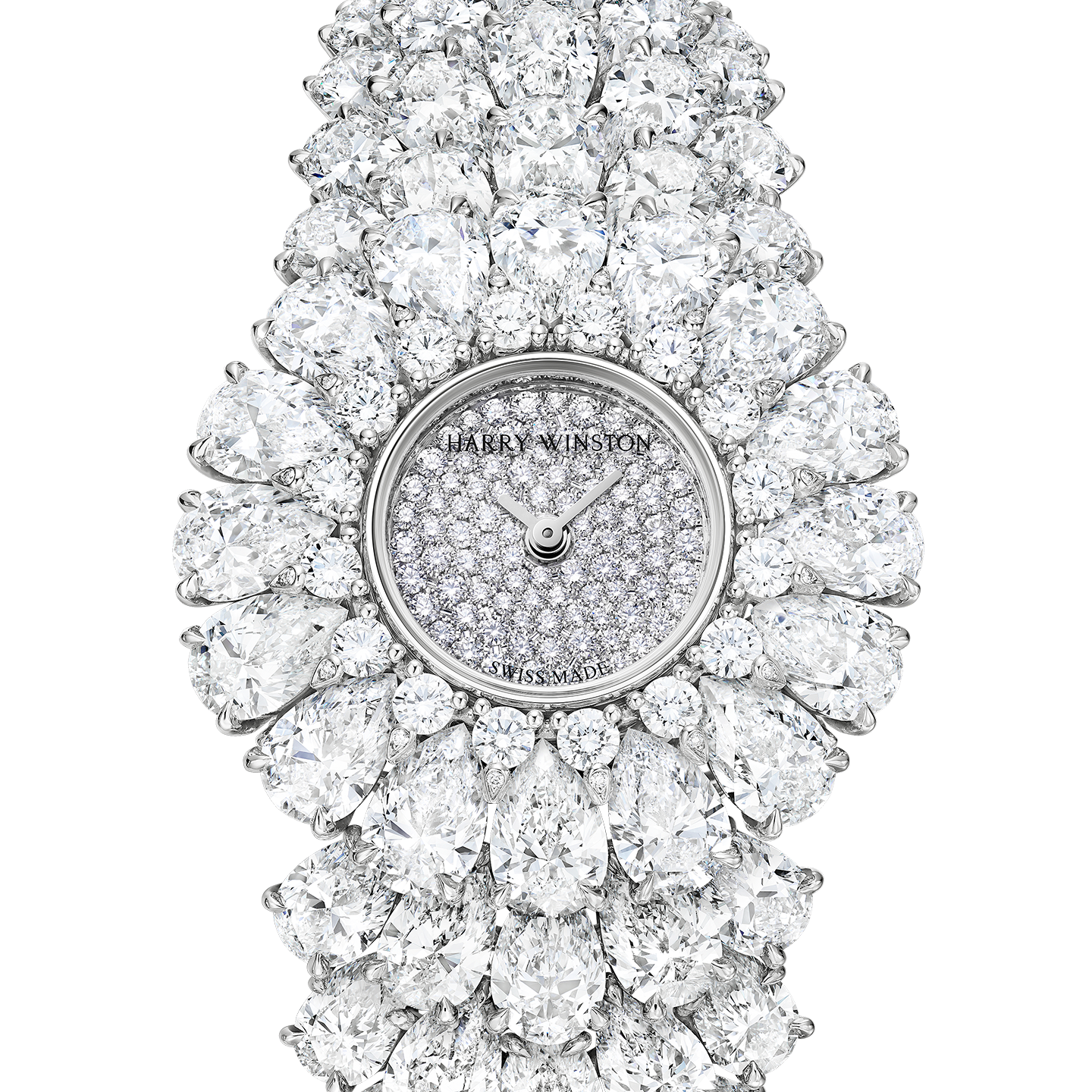 Mr. Winston's nickname "King of Diamonds" takes on its full meaning with the Halo High Jewelry Watch by Harry Winston. Entirely set with a cornucopia of magnificent brilliant-cut and pear-shaped diamonds, this stunning creation totals about 76 carats.