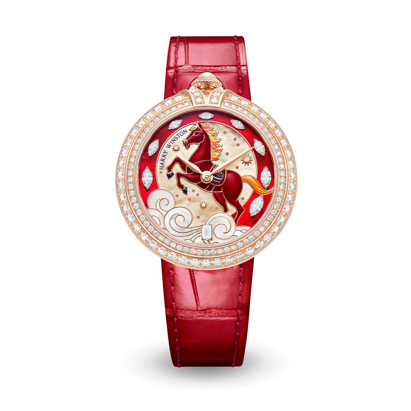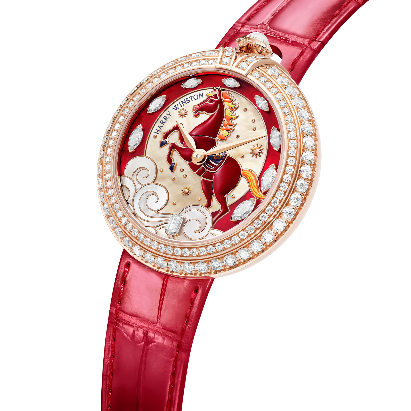 The House of Harry Winston celebrates the Chinese Year of the Horse with a limited-edition rose gold timepiece. Brought to life in vibrant red lacquer, the fiery horse on the dial embodies the independence, power, and adventurous spirit associated with the seventh animal of the Chinese zodiac, and is adorned with the irresistible glamour of the finest Harry Winston diamonds.