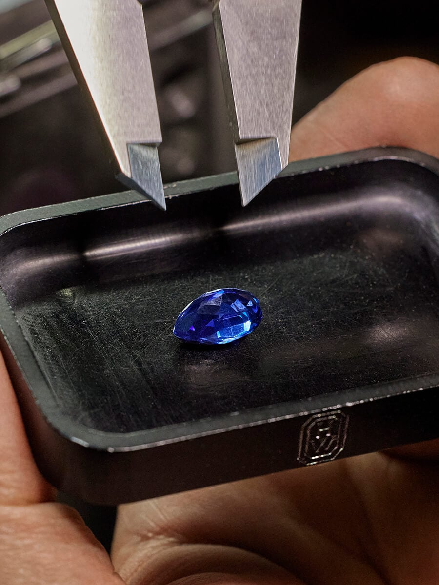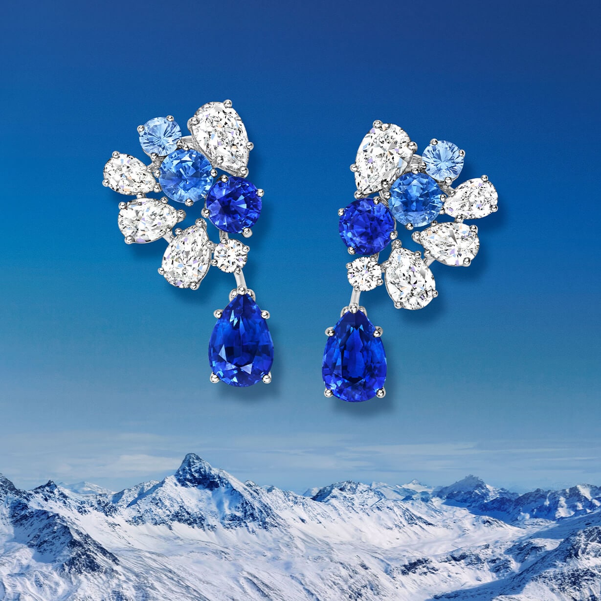 Framed by round sapphires and diamonds of various cuts, two pear-shaped Sri Lankan sapphires are a striking homage to the icy brilliance of St. Moritz during winter.