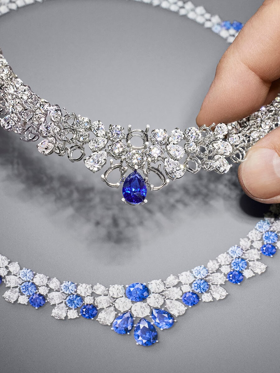 Beautifully modeled by a woman, the St. Moritz Necklace and Earrings are set against a majestic snow-capped mountain range that emphasizes the glistening diamonds and sapphires of these high jewelry creations. The scene transitions, zooming in on the intricate details of the diamond earrings, their pear-shaped sapphire pendants framed with round diamonds and sapphires. A beautiful collection honoring an exceptional landscape, these creations exemplify the balance of structure and fluidity that is required of such luxury jewelry pieces.