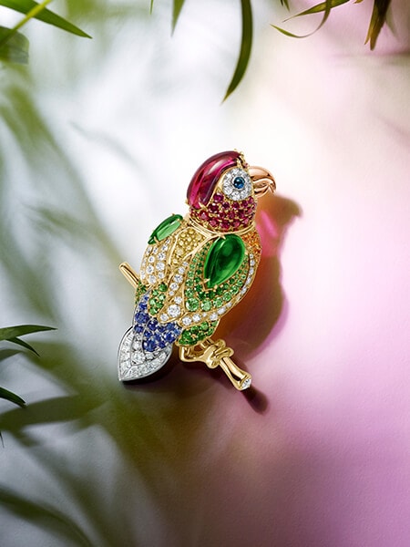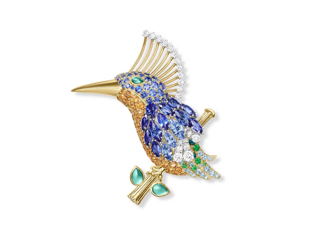 The Hummingbird Brooch evokes the fleeting beauty of its namesake mid-flight. Set with sapphires, tsavorites, aquamarines, and diamonds, the jewel radiates shades of green and blue, echoing the bird’s natural iridescence. A pear-shaped South Sea pearl delicately suspended from its beak evokes the image of the bird sipping nectar, bringing motion and life to this exquisite design.