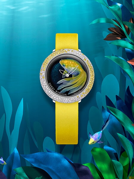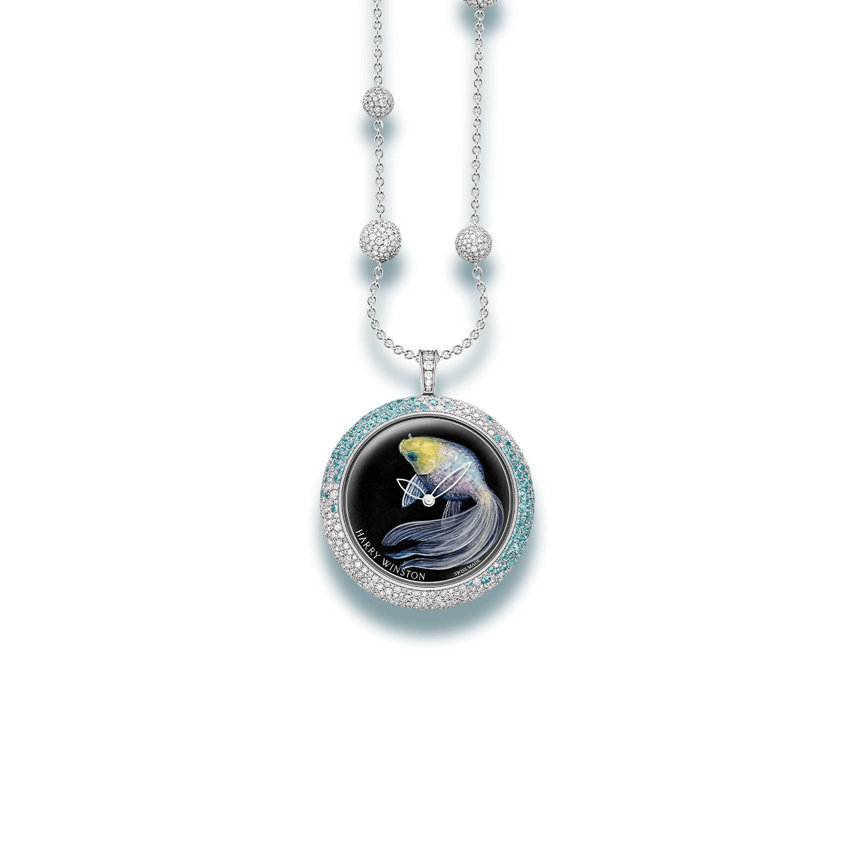 Evoking the unparalleled sense of depth applied to each Harry Winston Wild Treasures Marvelous Creation, the Mystic 18K white gold timepiece set with brilliant cut diamonds shimmers deep under the surface of the water, glistening in radiant shades of turquoise blue. Emerging from the dial, a painted goldfish comes to life, its flowing tail sweeping across the camera to reveal the timepiece transformed into a luxury pendant necklace with a snow-set diamond chain.