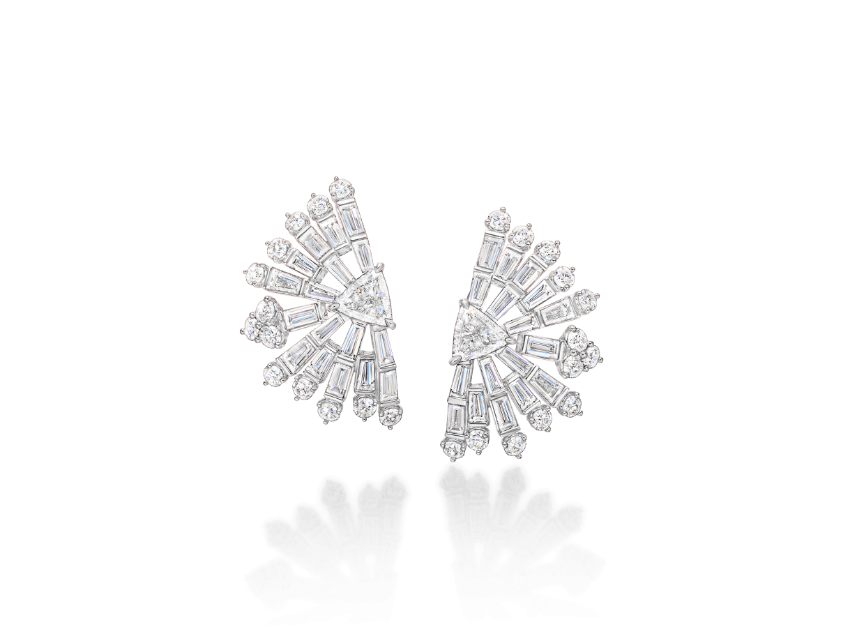 The jewels showcase Venice’s architectural elegance through two captivating trillion-cut diamonds accented by tapered baguette and round brilliant diamonds.