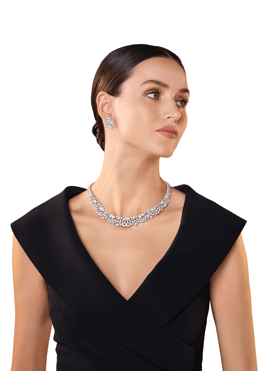 The Venice Suite is beautifully modeled on a woman with Venice in the background. Focus then shifts to the Venice Earrings, showcasing Venice’s architectural elegance through two captivating trillion-cut diamonds accented by tapered baguette and round brilliant diamonds. The piece concludes with a final close-up shot of the Venice Necklace on the woman’s neck.