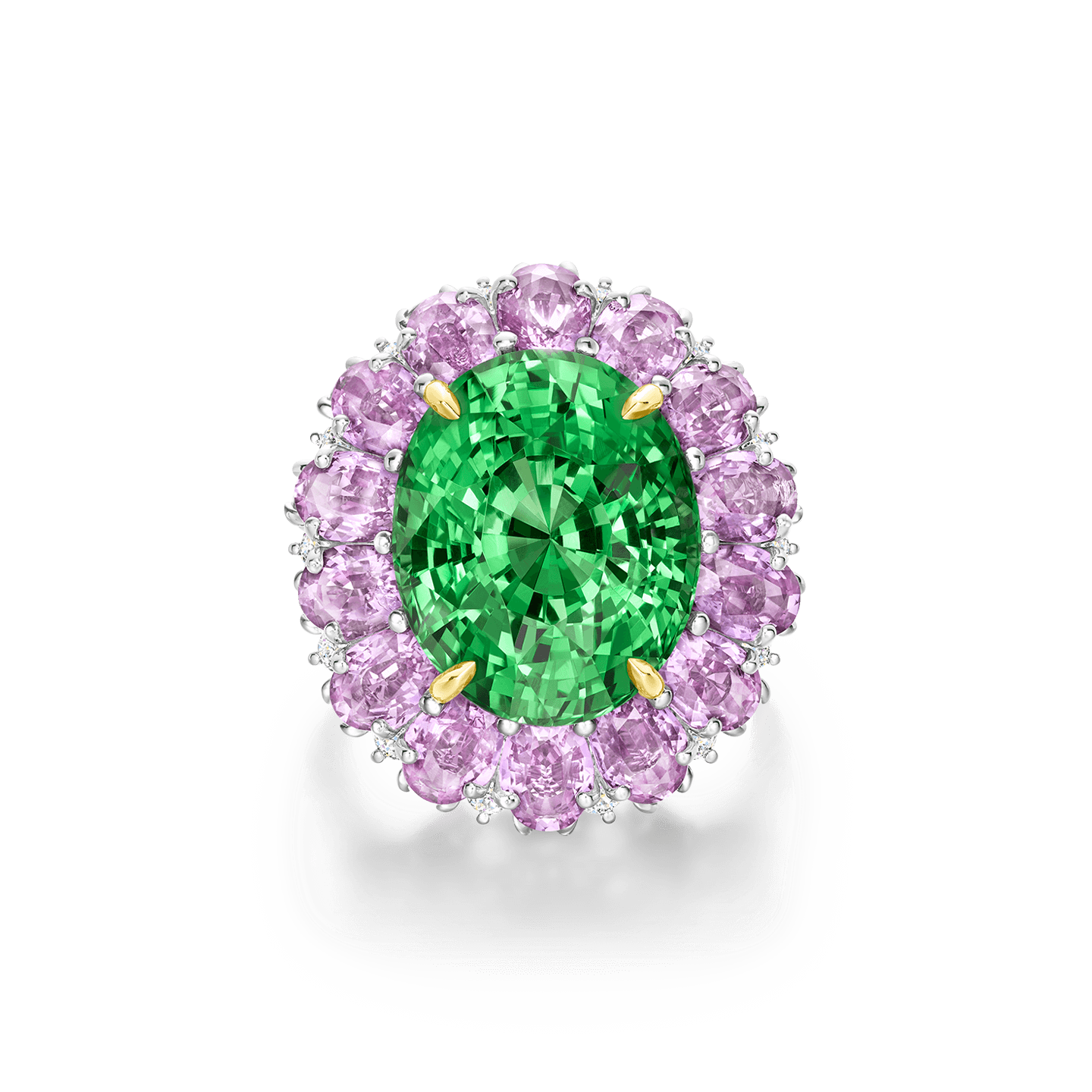 A rare 17.23 carat oval-shaped tsavorite center stone enlivens this one-of-a-kind cocktail ring. Surrounded by a halo of pink sapphires, peridots, yellow diamonds, and colorless diamonds, this decadent jewel seemingly floats upon the wearer’s hand in a subtle 18K yellow gold and platinum setting. Part of the House’s Winston Candy collection, this gem is a bejeweled confection beyond compare.